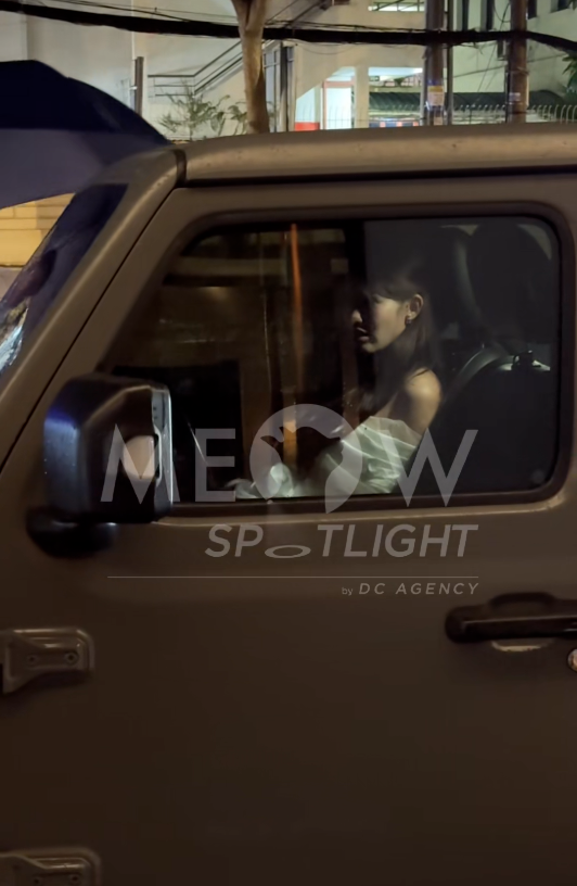 Á hậu Quỳnh Châu được chồng hộ tống ra về sau khi tiệc đám cưới kết thúc trên chiếc xe Jeep Wrangler có trị giá dao động từ 3 - 4 tỷ đồng. (Ảnh: chụp màn hình)