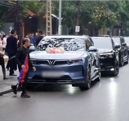 Dàn xe Vinfast xuất hiện trong đám cưới của á hậu Phương Nhi và con trai ông Phạm Nhật Vượng. (Ảnh: chụp màn hình)