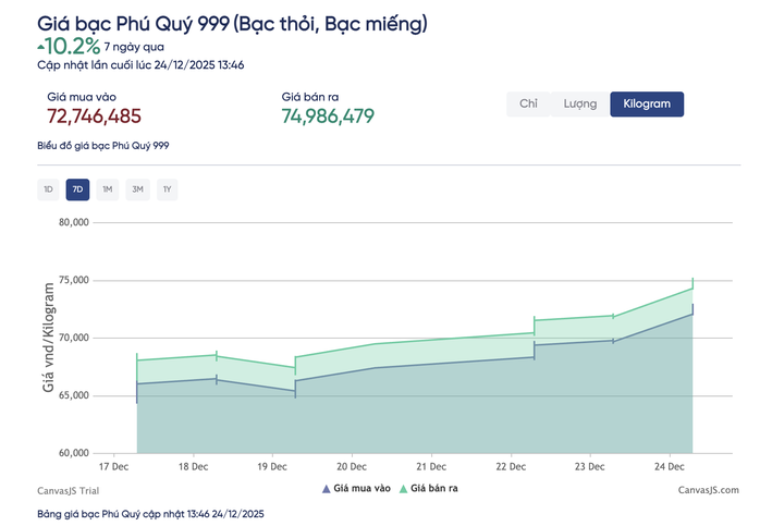Trưa 24-12, Công ty vàng bạc đá quý Sacombank (SBJ) niêm yết giá bạc miếng mua vào 2,715 triệu đồng/lượng, bán ra 2,784 triệu đồng/lượng, tăng tới 105.000 đồng mỗi lượng so với hôm qua.