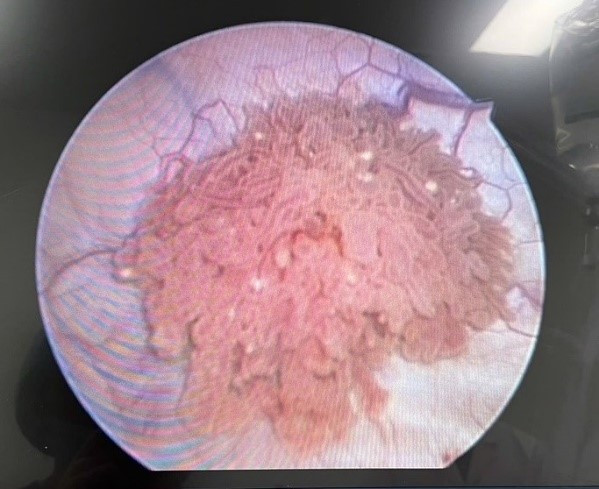 Các bác sĩ nghi ngờ u bàng quang nên tiến hành chỉ định soi bàng quang và chụp MRI cho bệnh nhân để chẩn đoán xác định. Kết quả soi bàng quang cho thấy: Hình ảnh u nhú bàng quang thành bên phải với kích thước khoảng 1cm. Sau hội chẩn, các bác sĩ quyết định tiến hành phẫu thuật nội soi bóc gọn u và chân u bàng quang bằng laser Holmium cho bệnh nhân.