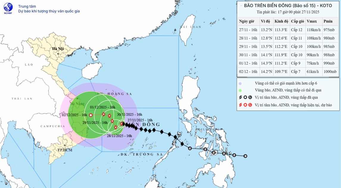 Cập nhật thông tin đến chiều tối 27-11 từ Trung tâm Dự báo khí tượng - thủy văn quốc gia, tâm bão số 15 đã di chuyển đến tọa độ khoảng 13,2 độ Vĩ Bắc - 113,3 độ Kinh Đông, cách đảo Song Tử Tây khoảng 230km về phía Bắc Tây Bắc. Sức gió mạnh nhất vùng gần tâm bão mạnh cấp 12 (118-133km/giờ), giật cấp 15. Bão di chuyển theo hướng Tây, tốc độ 5-10km/giờ. Tuy nhiên, từ nay đến ngày 2-12, bão sẽ liên tục đổi hướng trên quỹ đạo tiến vào vùng biển Nam Trung bộ.