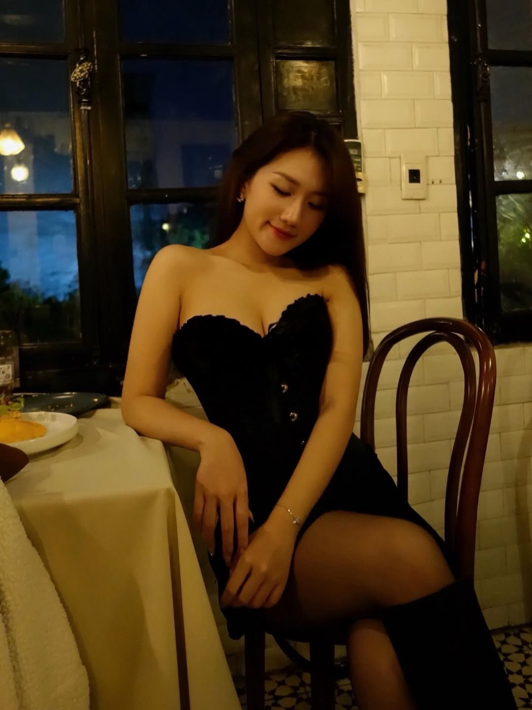 Linh Nắng chọn cho mình một chiếc váy đen cúp ngực đầy gợi cảm, tôn lên tối đa lợi thế hình thể và làn da trắng mịn màng.