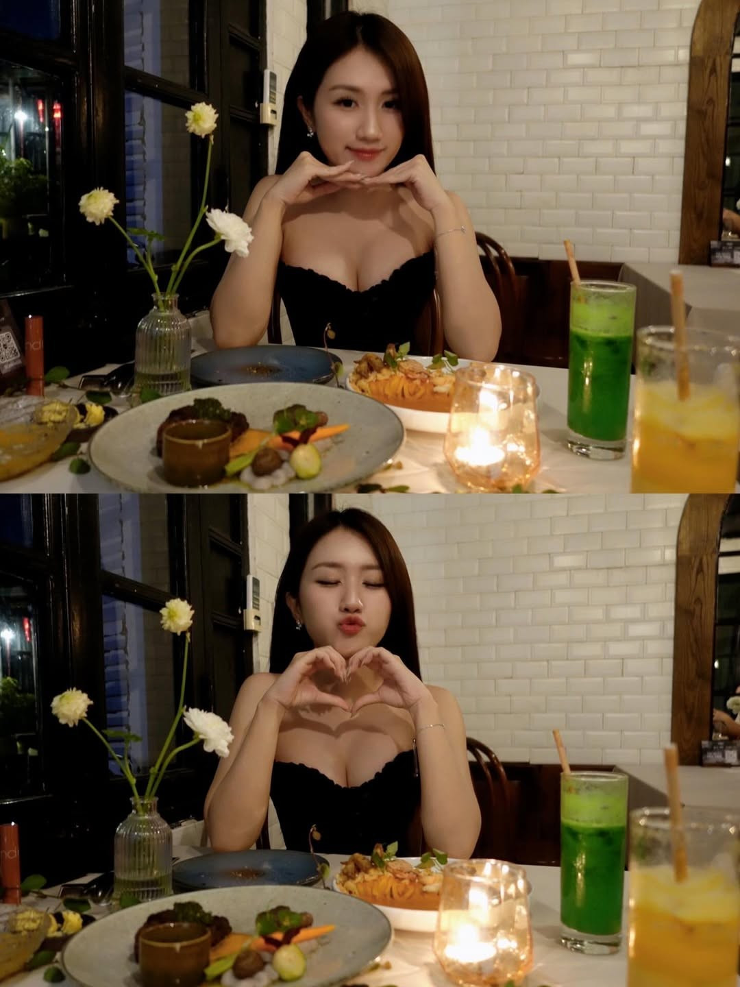 Trong không gian ấm cúng với ánh đèn vàng và nến, MC Linh Nắng tạo dáng yêu kiều đầy cuốn hút.