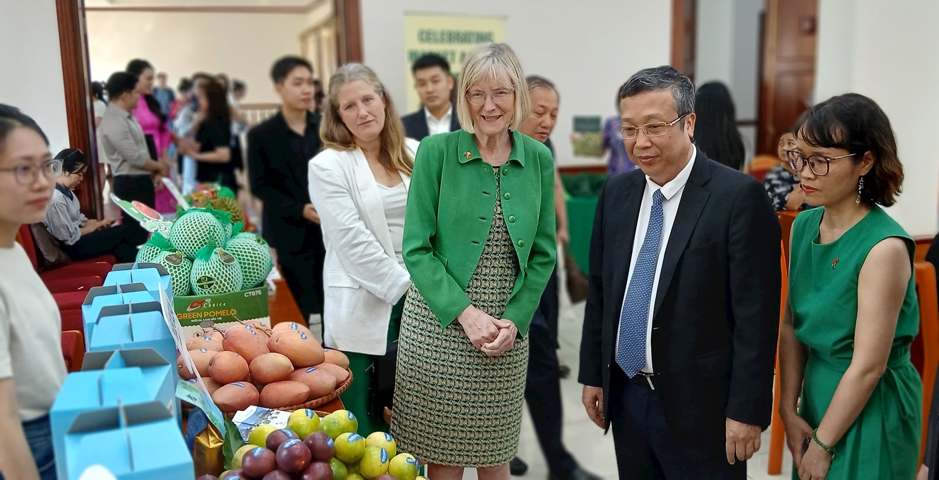 Thứ trưởng Bộ NNMT Hoàng Trung giới thiệu với đại biểu quốc tế về các sản phẩm nông sản Việt. Ảnh: N.Lộc