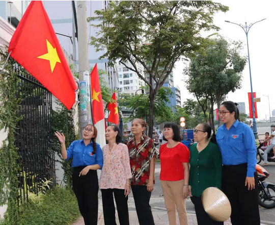 Người dân và đoàn viên thanh niên tham quan đường cờ Tổ quốc dịp 30-4.