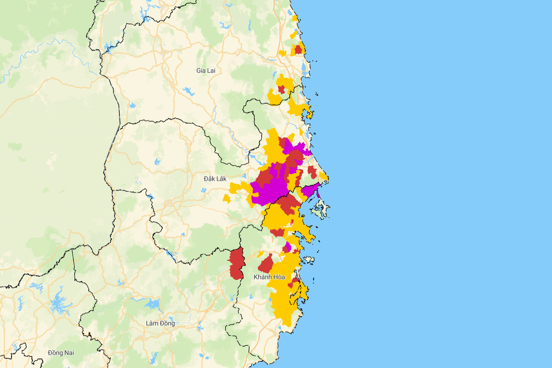 Mô hình độ ẩm đất cho thấy nhiều khu vực từ Đà Nẵng đến Lâm Đồng đã bão hòa. Trong 6 giờ tới, nguy cơ xảy ra lũ quét, sạt lở đất tại hàng chục xã, đặc biệt ở Khánh Hòa và Đắk Lắk (cấp rủi ro thiên tai 2).