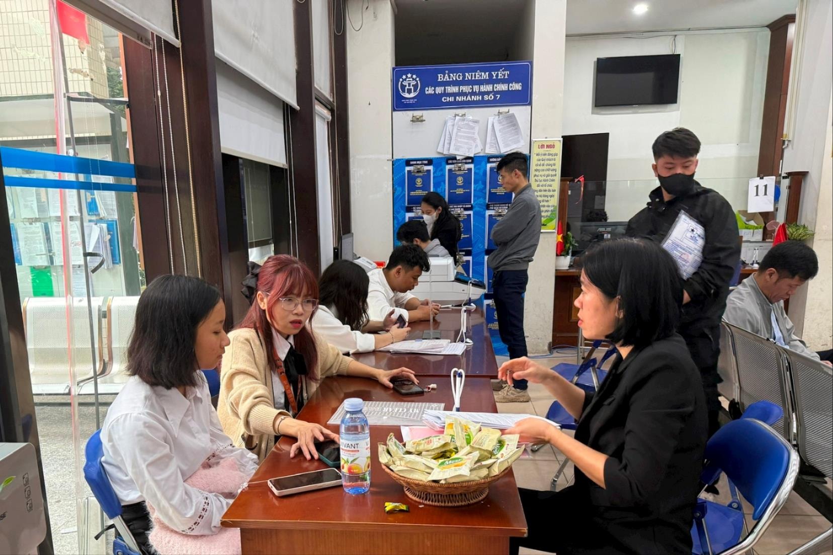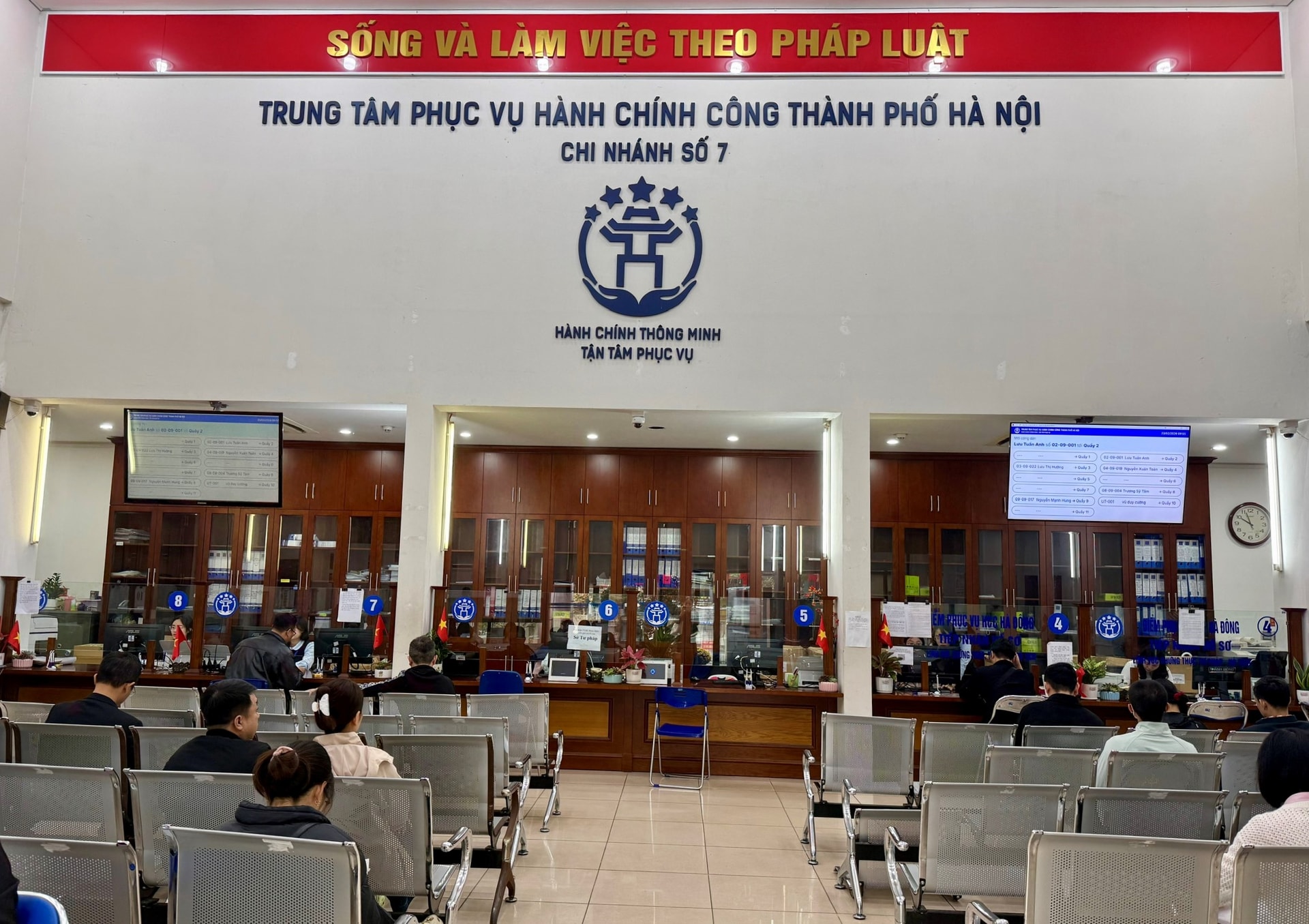 Tại Chi nhánh số 7 - Trung tâm Phục vụ hành chính công thành phố Hà Nội (phường Hà Đông), không khí làm việc diễn ra nghiêm túc, nền nếp. Ngay từ đầu giờ sáng, khá đông người dân đến giao dịch, nộp hồ sơ, thực hiện các thủ tục hành chính.