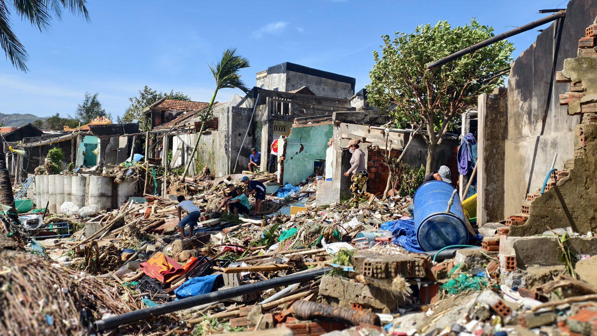 Một góc làng chài ven biển của tỉnh Gia Lai tan hoang sau bão số 13. Ảnh: Chí Đại.