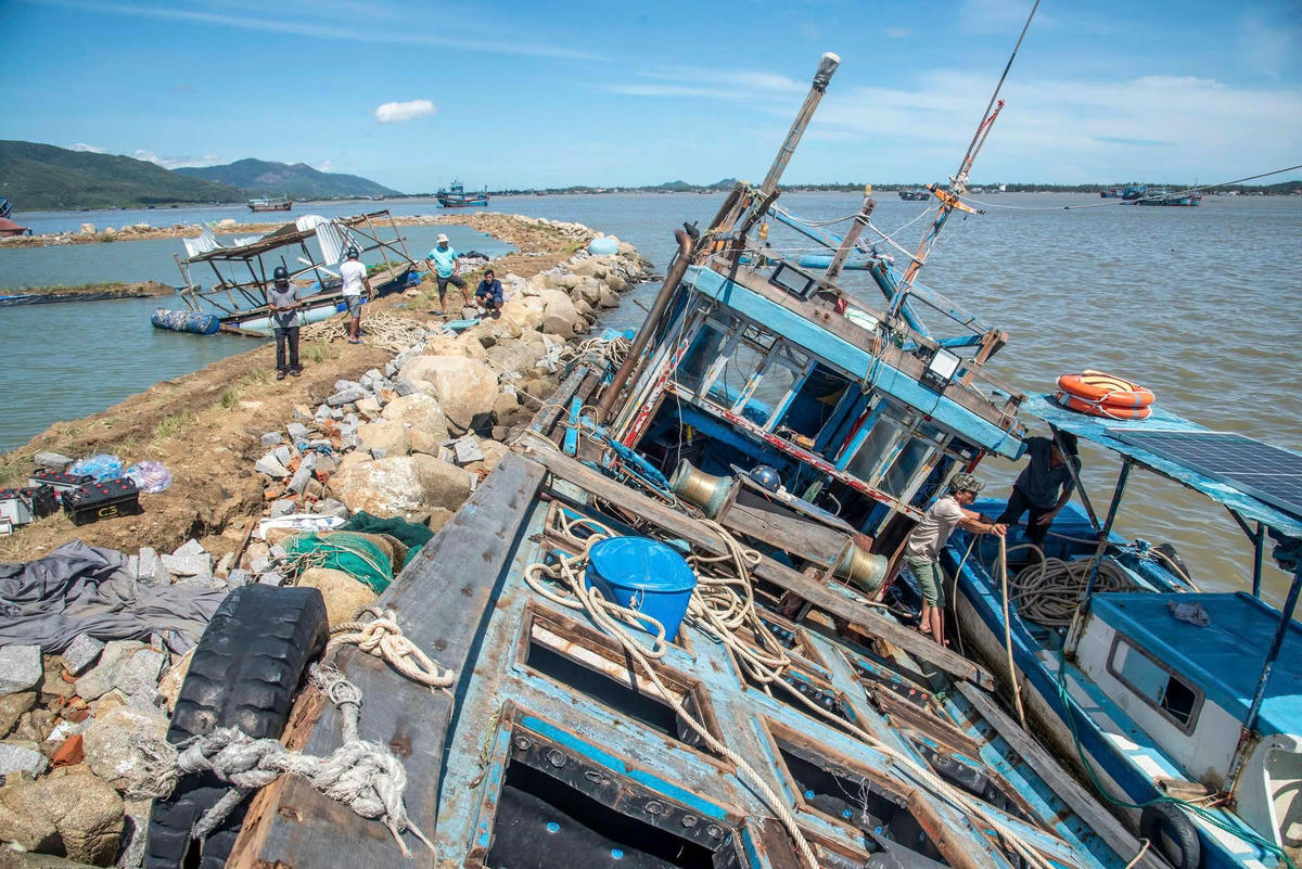 Tàu thuyền của ngư dân xã Đề Gi bị sóng đánh vào trong bờ. Ảnh: Tấn Thành.