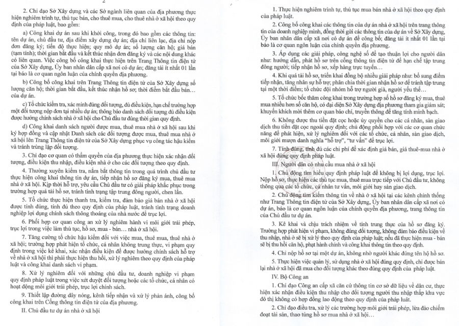 Đối với chủ đầu tư dự án nhà ở xã hội, Thủ tướng yêu cầu phải thực hiện nghiêm trình tự, thủ tục mua bán nhà ở xã hội theo quy định của pháp luật; công bố công khai các thông tin của dự án nhà ở xã hội trên trang thông tin của doanh nghiệp mình, đồng thời gửi các thông tin của dự án về Sở Xây dựng, Ủy ban nhân dân cấp xã nơi có dự án để công bố; đăng tải ít nhất 01 lần tại báo là cơ quan ngôn luận của chính quyền địa phương.