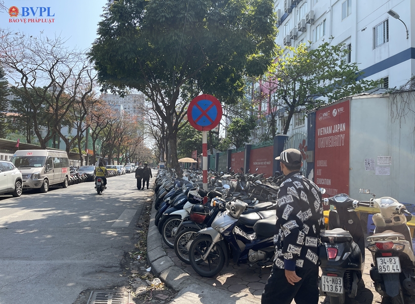 Vỉa hè trước cổng Trường Đại học Việt Nhật trên phố Lưu Hữu Phước bị chiếm dụng thành bãi trông giữ xe chật kín vỉa hè, người đi bộ phải đi dưới lòng đường.