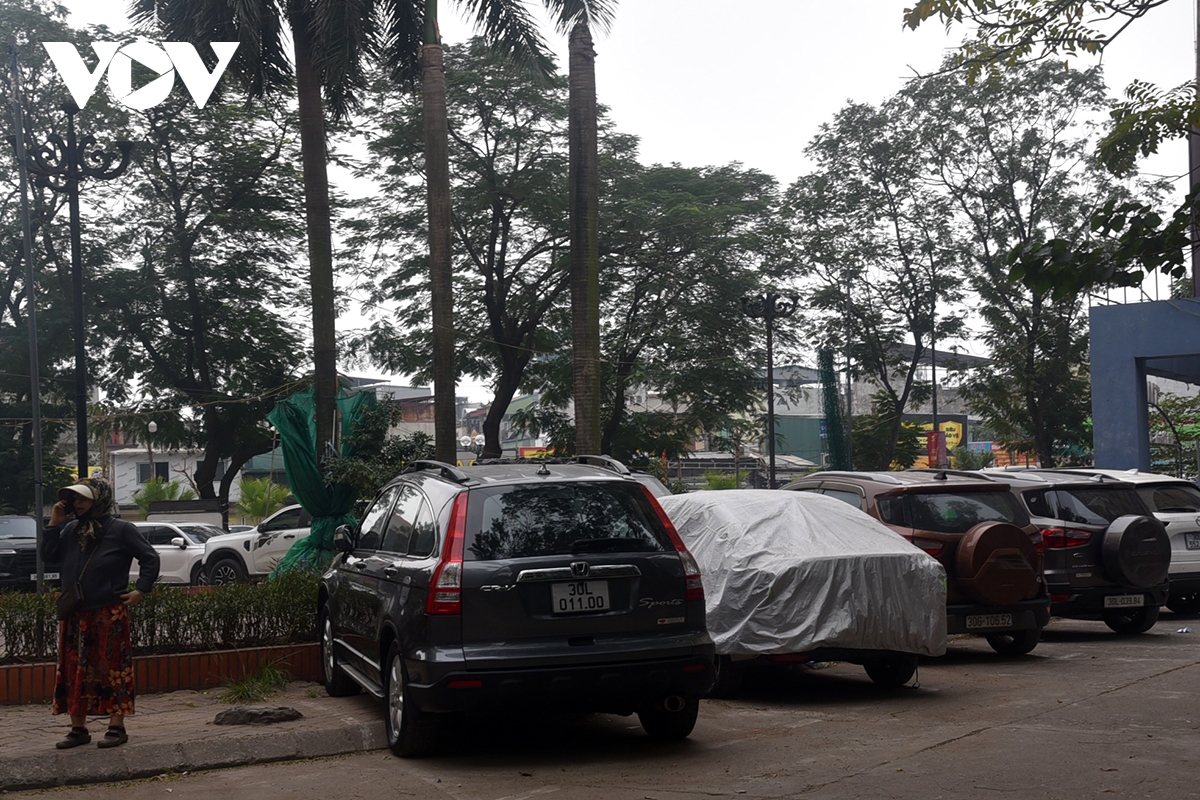 Lối đi bộ trong vườn hoa KĐT Định Công bị xe ô tô chiếm dụng, buộc người dân phải đi vòng hoặc len lỏi giữa các xe đang đỗ.