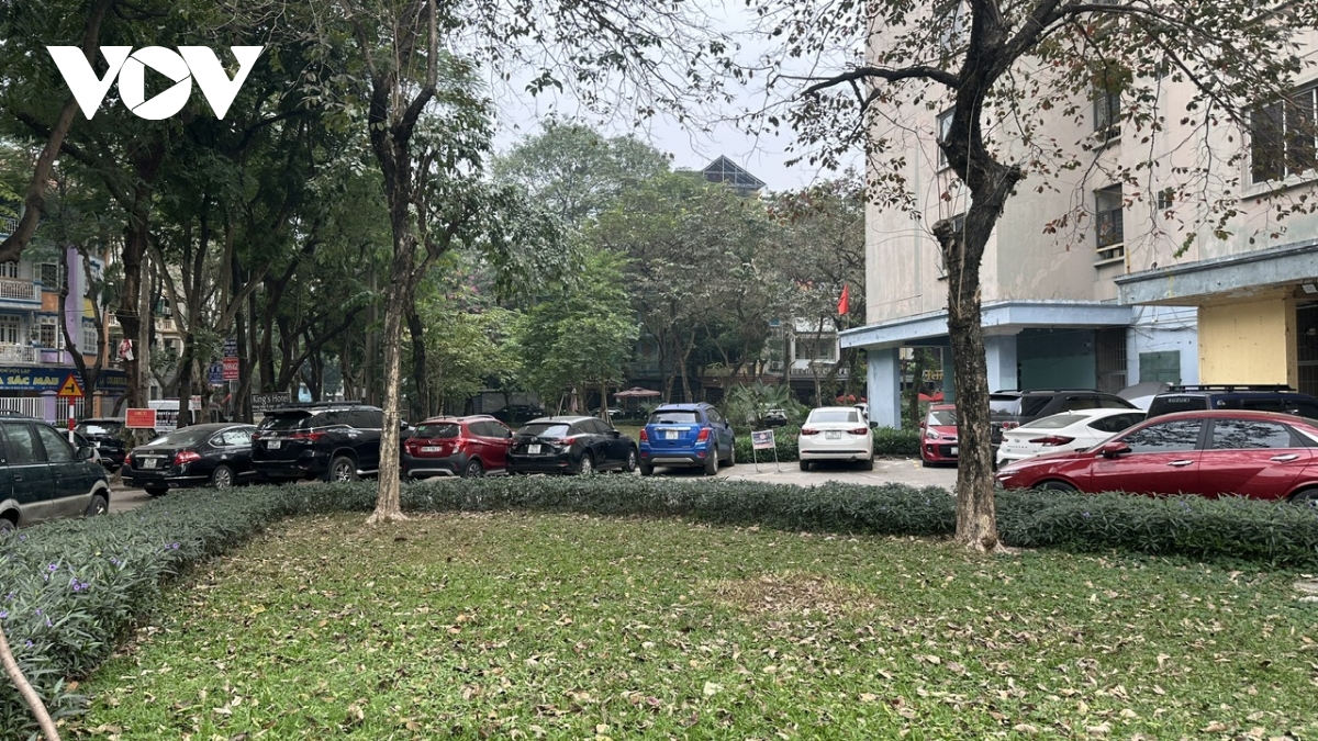 Không gian xanh dưới chân một tòa nhà trên phố Linh Đàm thuộc KĐT Bắc Linh Đàm là một bãi đỗ xe tự phát.