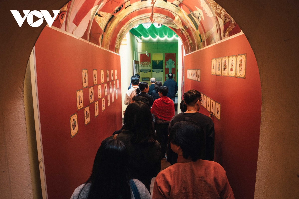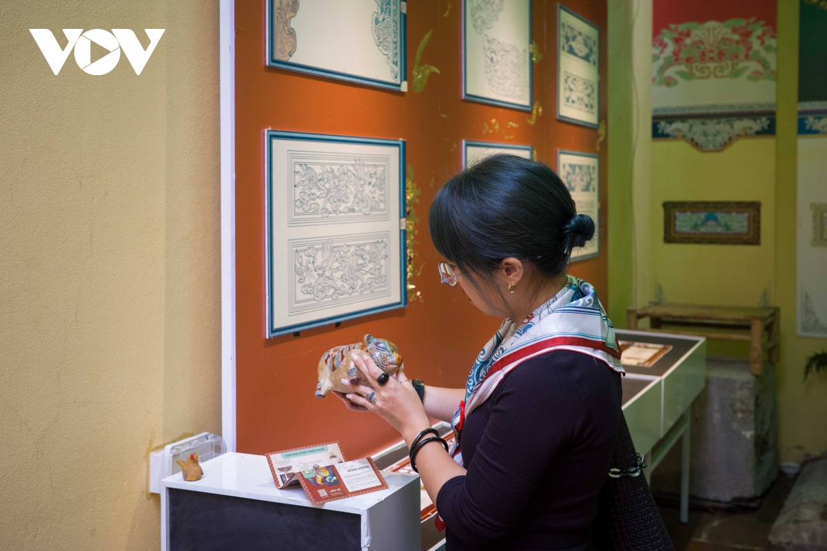 Khách tham quan tại “Không gian kể chuyện đình Kim Ngân”, Từ hoa văn Đặc hữu – Kể chuyện về chữ Nghệ.