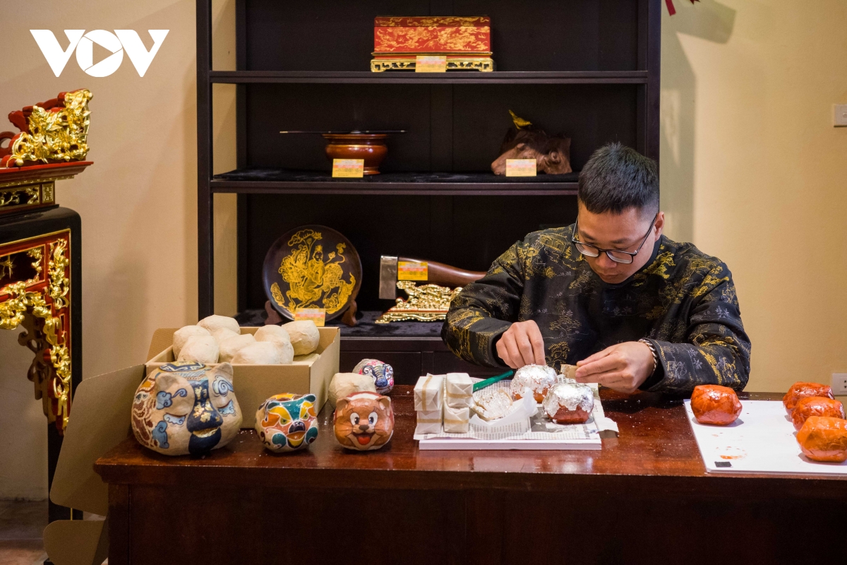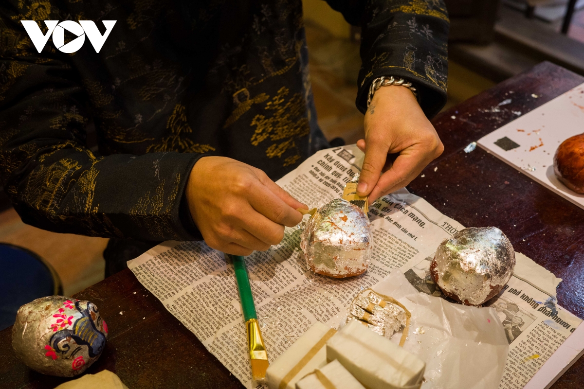 Anh Nguyễn Văn Ninh, người làng Kiệu Kỵ, thực hiện kỹ thuật dán bạc truyền thống trong không gian trải nghiệm của đình Kim Ngân. Đây là một trong những thao tác đặc trưng của nghề kim hoàn xưa, được trình diễn trực tiếp để giúp du khách hiểu rõ hơn về quá trình “rèn nghề thành nghệ”.