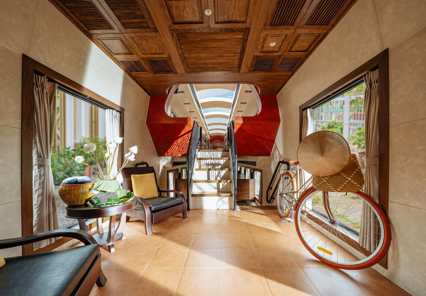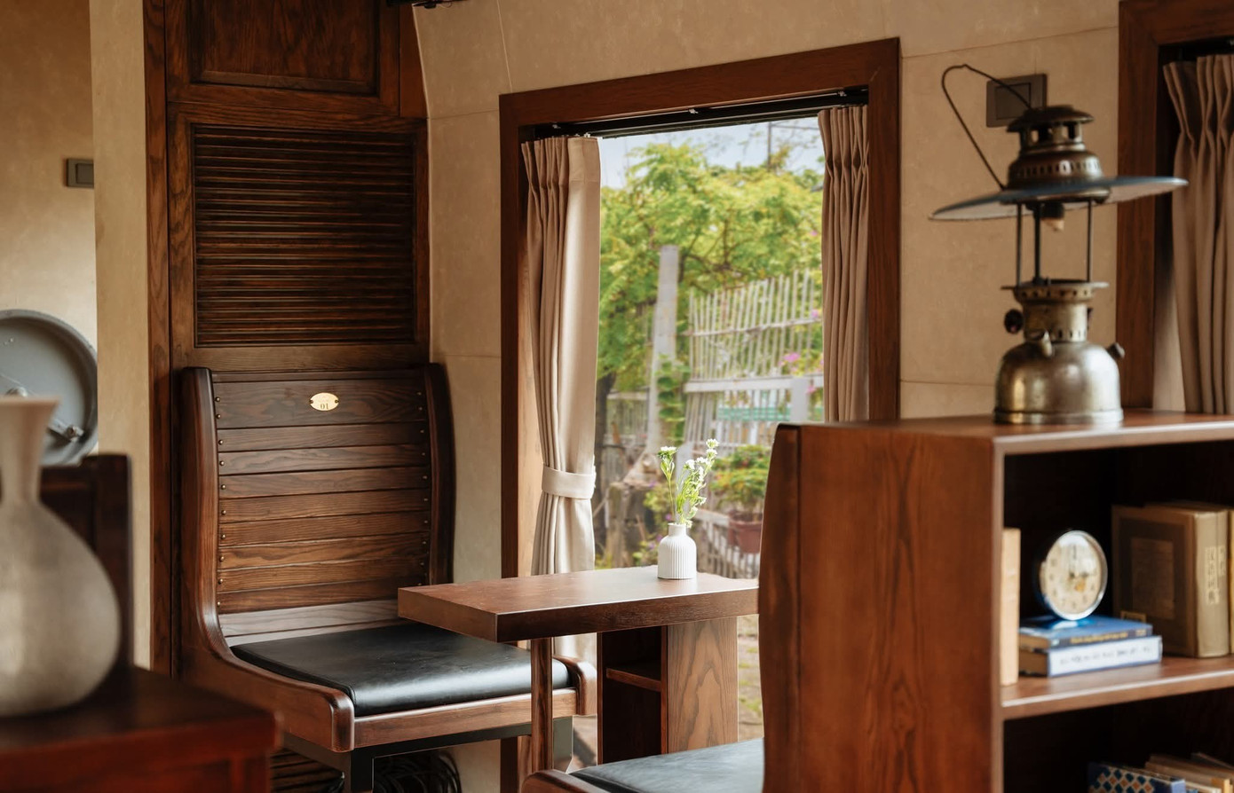 Ký ức về Hà Nội những ngày xưa cũ được tái hiện rõ nét và đầy đủ trong không gian toa tàu. Từ bộ bàn ghế cũ, chiếc tủ gác măng giê, đèn dầu, cửa sổ lá sách, chiếc xe đạp khung ngang cũ...