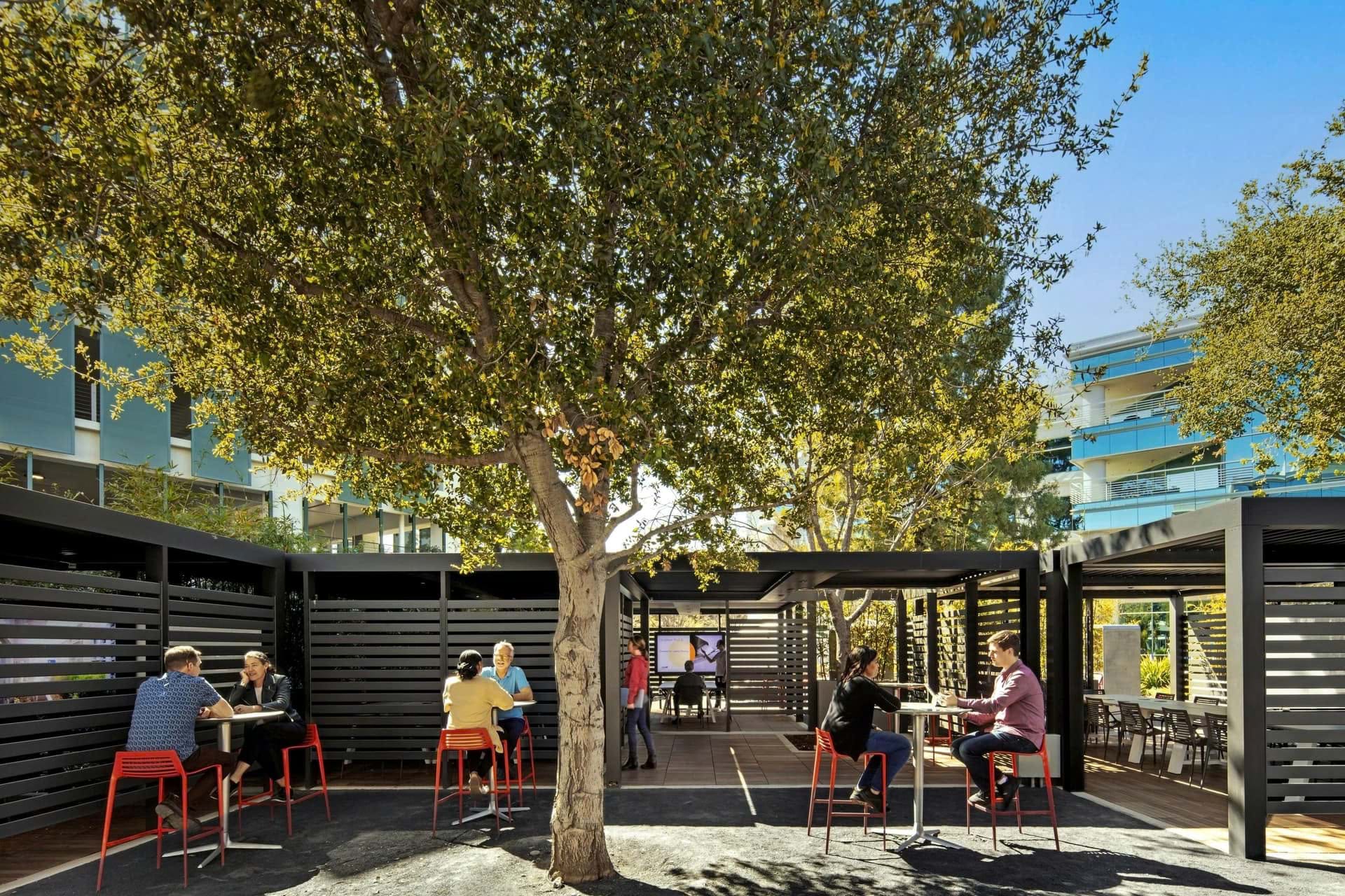 Các khu vực làm việc ngoài trời nằm hòa hợp với cảnh quan khuôn viên tạo nên một môi trường làm việc thay thế lành mạnh. Nguồn: NBBJ.