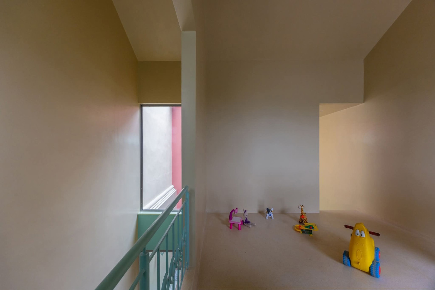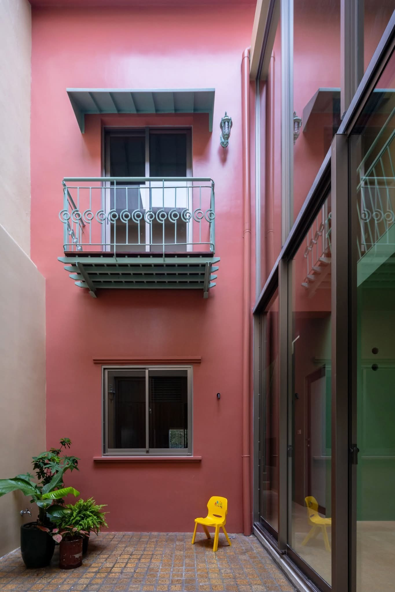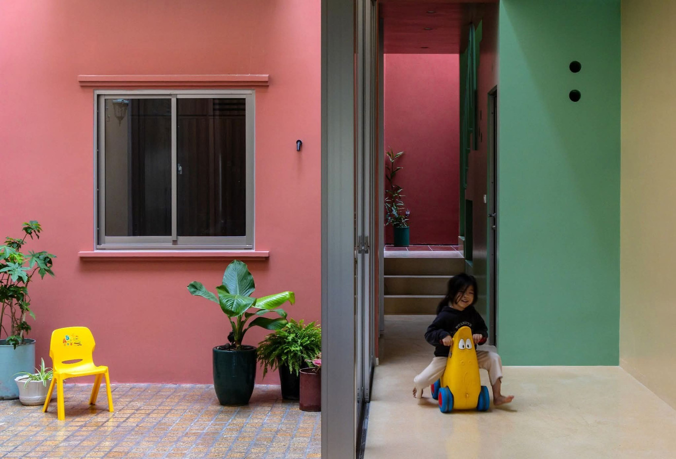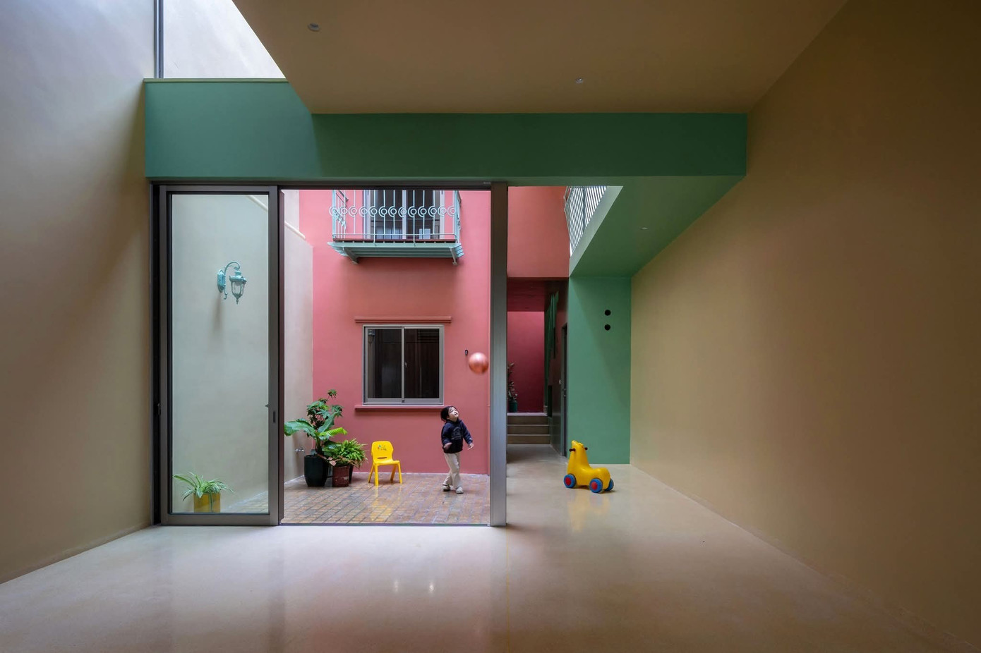 Bên trong, công trình mở ra một thế giới đầy màu sắc: những mảng tường xanh lá, vàng kem, đỏ gạch đan xen trong một nhịp điệu tươi vui và mềm mại. Các không gian được tổ chức xoay quanh sân trong rộng thoáng, nơi ánh sáng và gió trời tự nhiên chảy tràn, nơi trẻ nhỏ chơi đùa, nơi cây xanh vươn mình và những món đồ chơi nhỏ xinh trở thành một phần của kiến trúc sống.