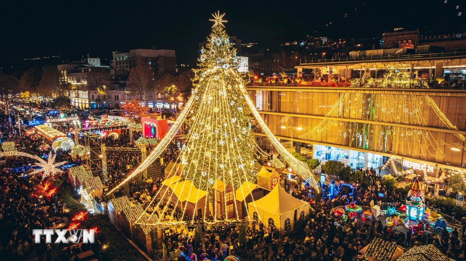 Cây thông được trang hoàng rực rỡ tại quảng trường ở Tbilisi, Gruzia. (Ảnh: THX/TTXVN)