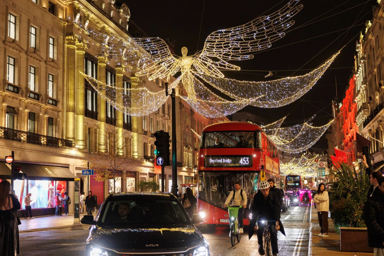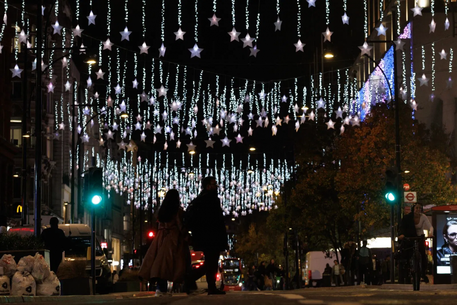 Đèn Giáng sinh được bật sáng trên phố Oxford vào ngày 06/11/2025 tại London, Anh. (Ảnh:Dan Kitwood/Getty Images)