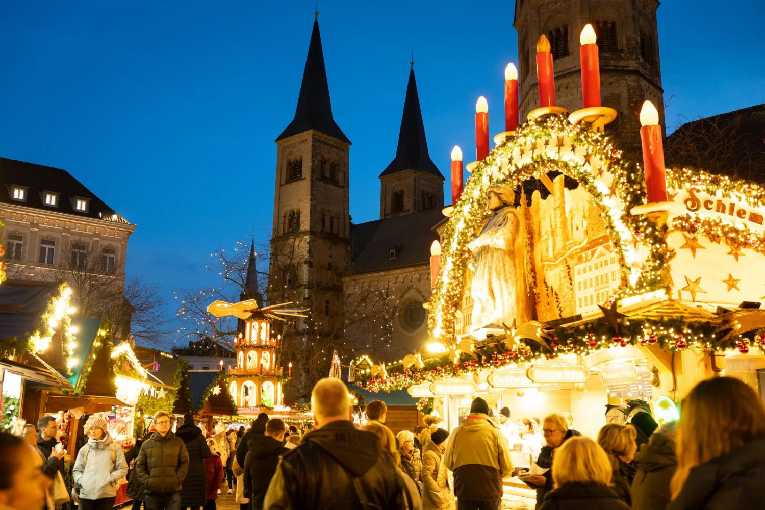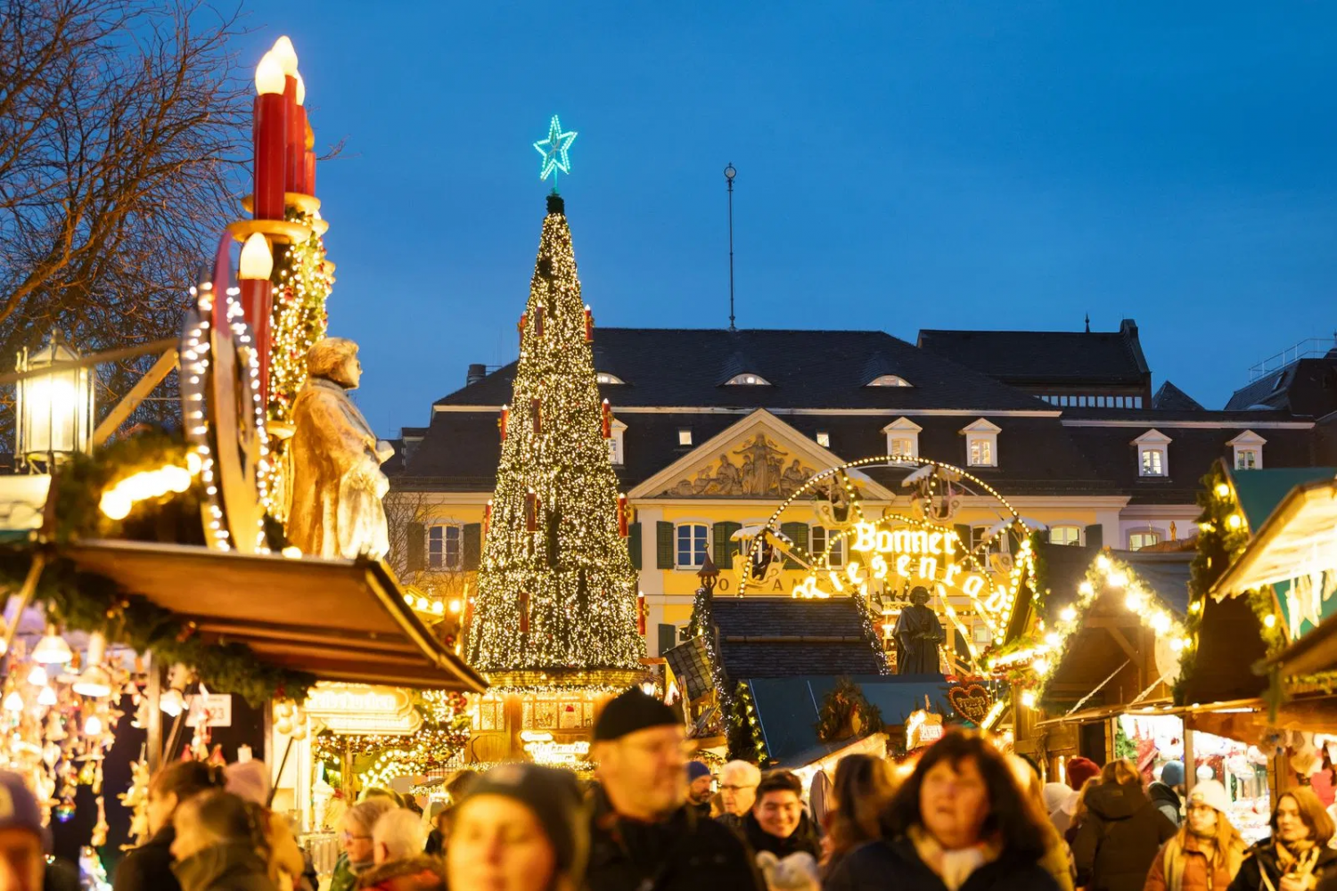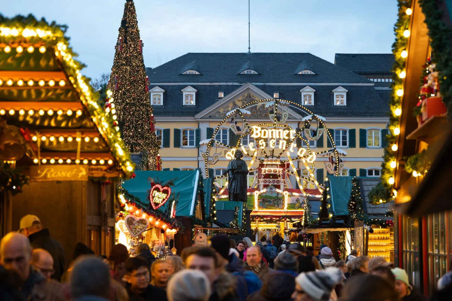 Người dân đi dạo qua các gian hàng tại chợ Giáng sinh thường niên gần kim tự tháp Giáng sinh ở Bonn, Đức.(Ảnh: Andreas Rentz/Getty Images)