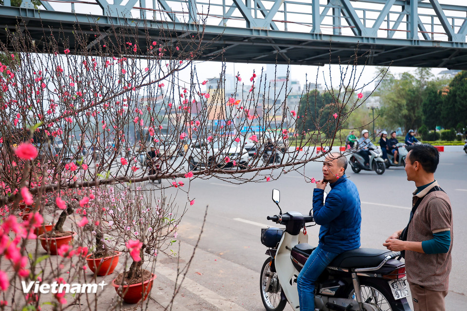 Theo chia sẻ của một số tiểu thương, đào huyền năm nay được nhiều người lựa chọn vì hoa nở to đẹp, tuy nhiên rất 'kén' khách bởi cành đào huyền chiếm không gian trưng bày lớn. (Ảnh: Hoài Nam/Vietnam+)