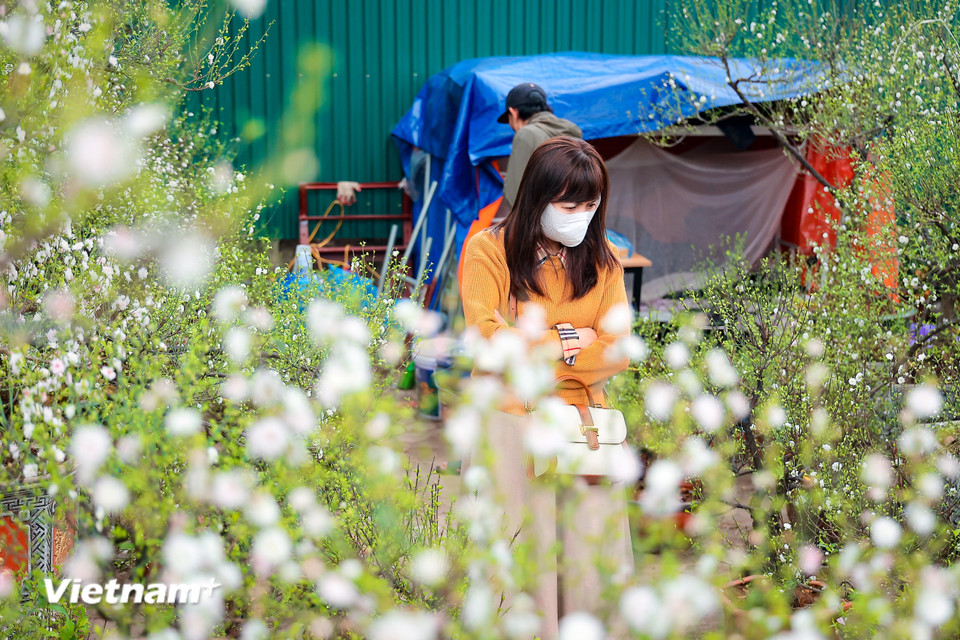 Bên cạnh sắc hồng của đào là vẻ đẹp của màu trắng nhất chi mai từ vùng cao được vận chuyển về Thủ đô để 'đón Tết.' (Ảnh: Hoài Nam/Vietnam+)
