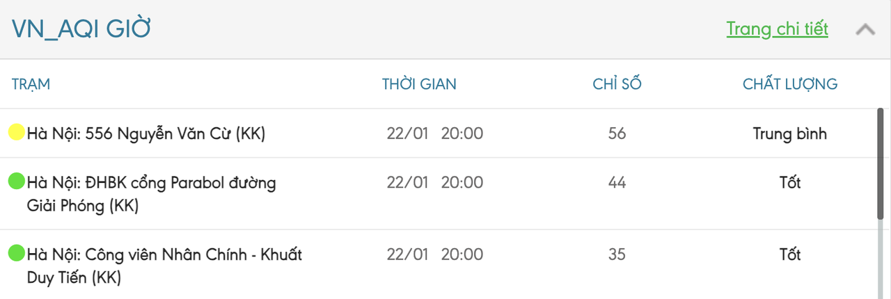 Cụ thể, vào thời điểm 8 giờ, trạm quan trắc 556 Nguyễn Văn Cừ ghi nhận AQI ở mức 21; trạm quan trắc Đại học Bách khoa (cổng Parabol, đường Giải Phóng) ghi nhận AQI ở mức 27; trong khi trạm Công viên Nhân Chính – Khuất Duy Tiến có AQI ở mức 22. Các chỉ số này phản ánh chất lượng không khí tại nhiều khu vực nội đô Hà Nội đã đạt mức an toàn cho sức khỏe cộng đồng.
