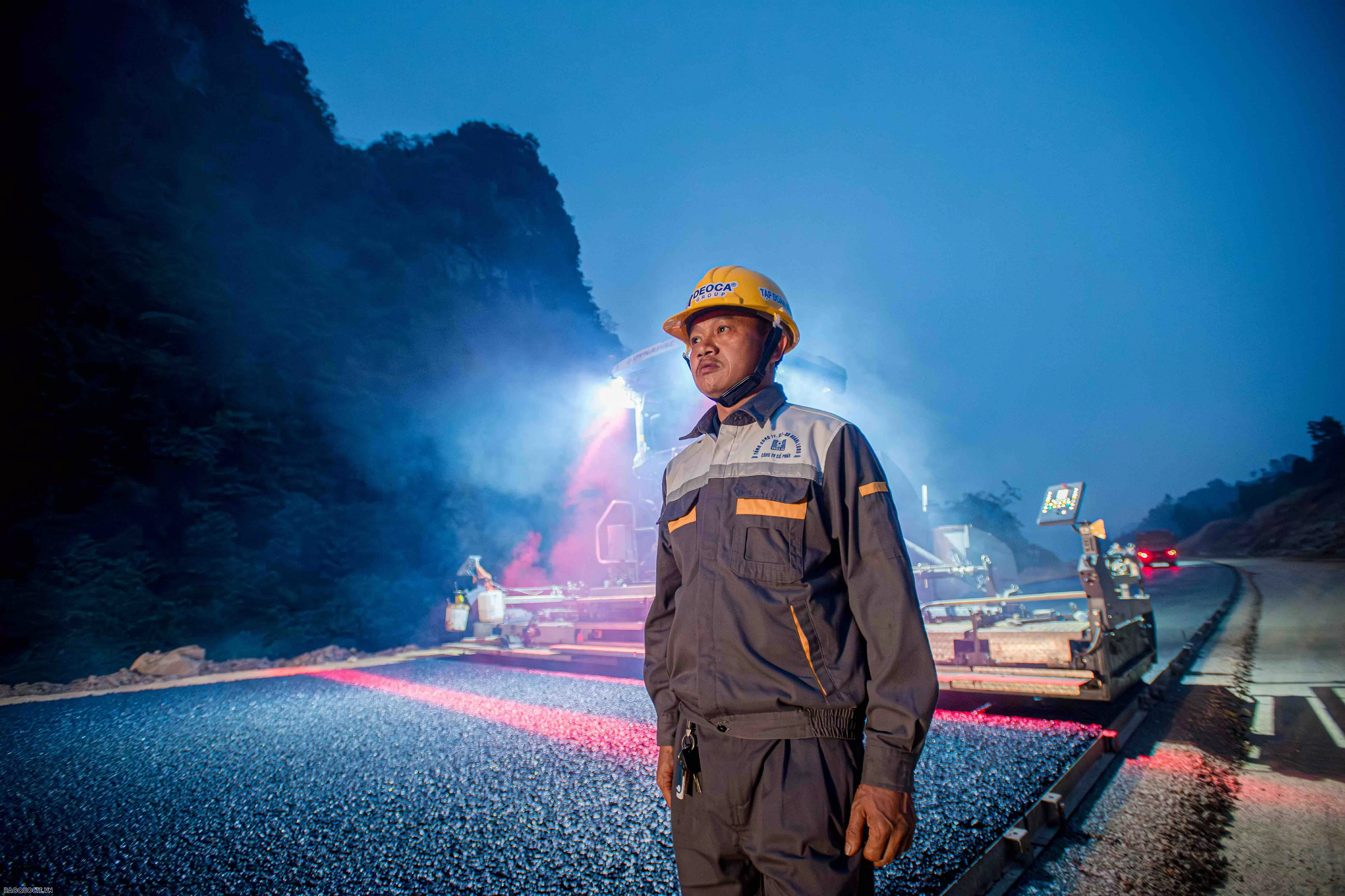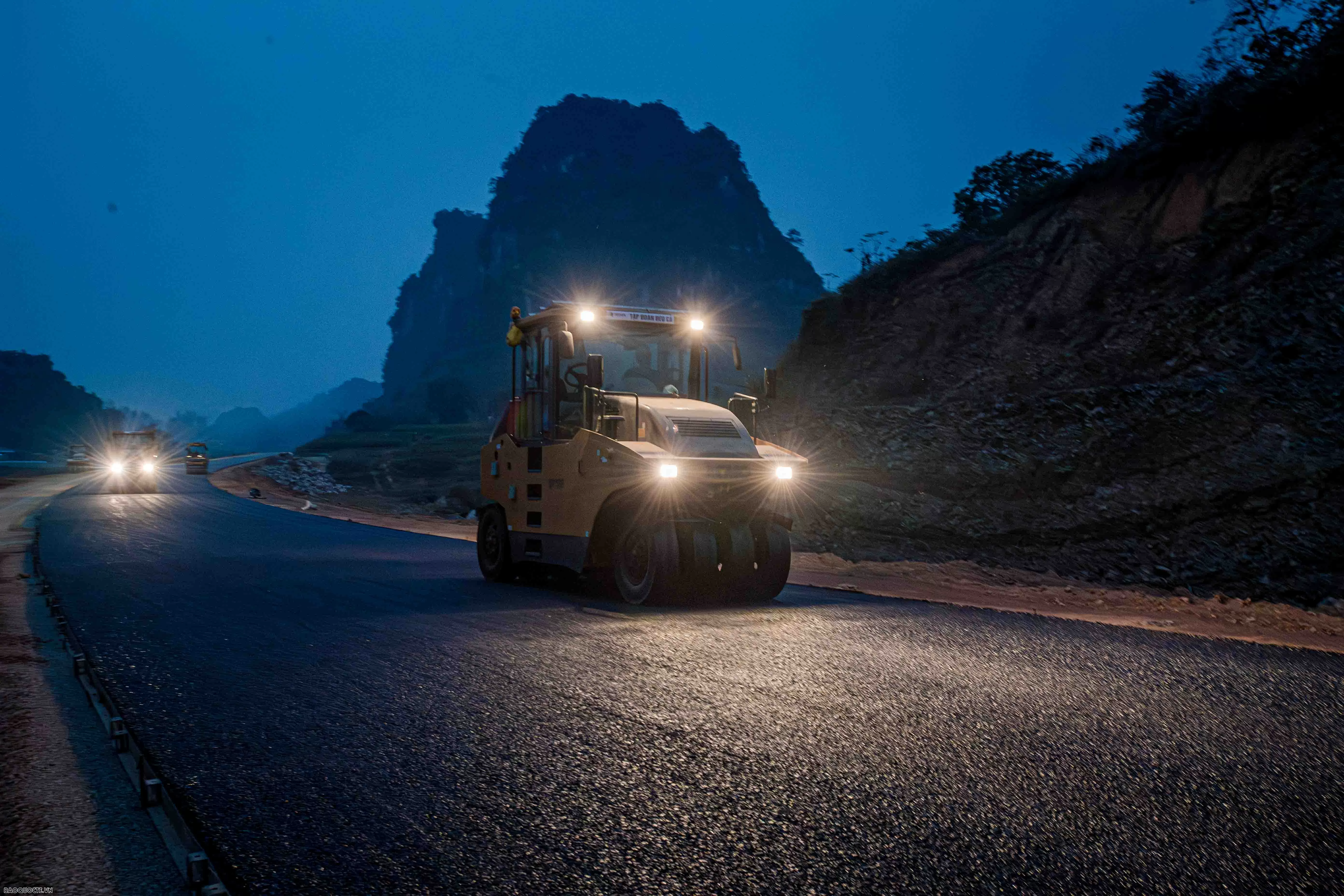 Tại khu vực Km58 (xã Đông Khê, tỉnh Cao Bằng), chỉ sau hai ngày triển khai, lực lượng thi công đã trải thảm được hơn 1 km bê tông nhựa. Hiện dây chuyền thảm nhựa vẫn duy trì thi công cả ngày lẫn đêm để tăng sản lượng lên mức khoảng 2.000 tấn mỗi ngày. (Ảnh: Nguyễn Hồng)