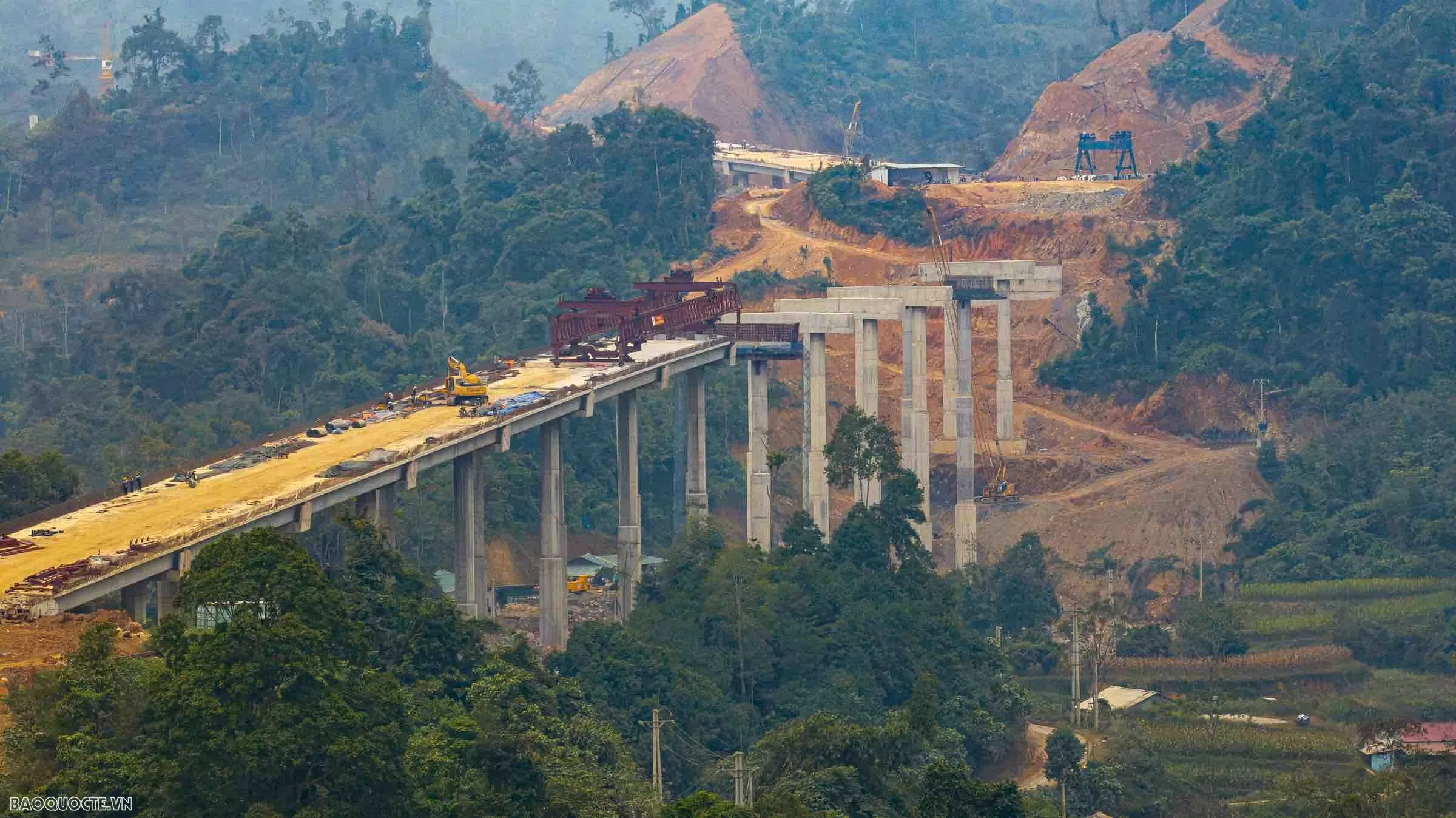Cao tốc Đồng Đăng - Trà Lĩnh có tổng chiều dài 121 km, được phân kỳ đầu tư thành 2 giai đoạn với tổng mức đầu tư gần 23.000 tỷ đồng. Trải dài qua địa phận Lạng Sơn và Cao Bằng, giai đoạn 1 của dự án dài hơn 93km bao gồm 64 cây cầu vượt bắc qua hai dòng sông Kỳ Cùng, Bằng Giang cùng vô số khe suối và tỉnh lộ. (Ảnh: Nguyễn Hồng)
