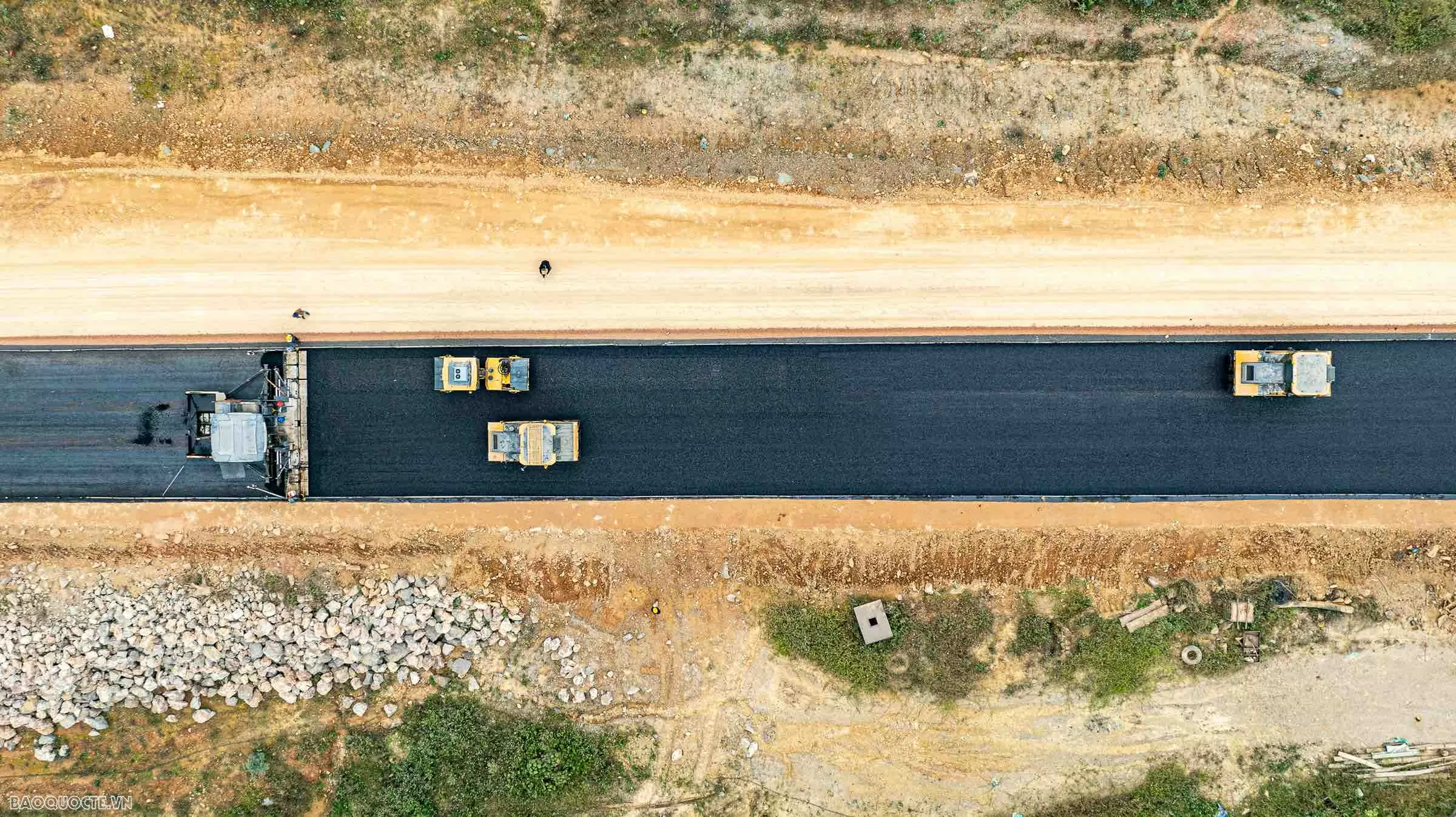 Trước ngày 19/12 sắp tới, dự án đặt hoàn thành mục tiêu thông toàn bộ nền, mặt đường trên tuyến chính 85/93 km, (trừ một số vị trí bị ảnh hưởng bởi mưa lũ và các cầu bổ sung). Đến trước Tết Nguyên đán 2026, dự án phấn đấu thông tuyến trên lớp bê tông nhựa khoảng 44 km, thông tuyến trên nền cấp phối đá dăm khoảng 45 km, thông tuyến trên nền đường K95, K98 khoảng 4 km (trừ các cầu phát sinh). (Ảnh: Nguyễn Hồng)