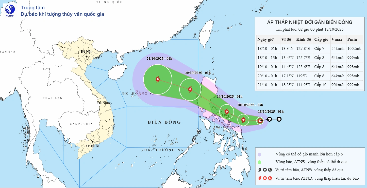 Dự báo về áp thấp nhiệt đới gần Biển Đông, Trung tâm Dự báo khí tượng thủy văn Quốc gia cho biết, hồi 01 giờ ngày 18/10, vị trí tâm áp thấp nhiệt đới ở vào khoảng 13,3 độ Vĩ Bắc; 127,8 độ Kinh Đông, trên vùng biển phía Đông miền Trung Philippin.