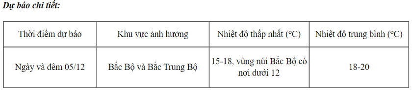 Theo dự báo của Trung tâm Khí tượng Thủy văn quốc gia, không khí lạnh tiếp tục tăng cường yếu, ảnh hưởng đến các nơi khác ở Trung Trung Bộ. Gió Đông Bắc mạnh cấp 2-3, vùng ven biển cấp 3-4. Bắc Bộ và Bắc Trung Bộ có mưa nhỏ vài nơi, trời rét; vùng núi cao Bắc Bộ có nơi rét đậm. Nhiệt độ thấp nhất phổ biến 15-18 độ, vùng núi Bắc Bộ có nơi dưới 12 độ.
