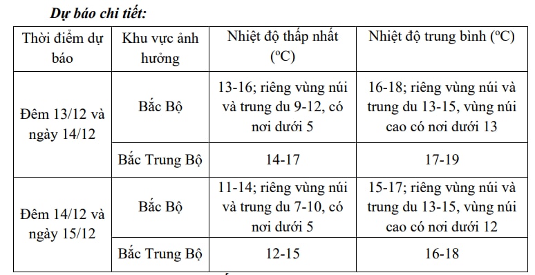 Từ đêm 13/12, khu vực Bắc Trung Bộ trời chuyển rét. Nhiệt độ thấp nhất trong đợt không khí lạnh này ở khu vực vùng núi và trung du Bắc Bộ phổ biến từ 7-10 độ, vùng núi cao có nơi dưới 5 độ; ở khu vực đồng bằng Bắc Bộ phổ biến từ 11-14 độ; ở Bắc Trung Bộ phổ biến từ 12-15 độ.