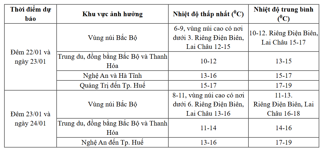 Trên đất liền, chiều tối và đêm 22/1, không khí lạnh tiếp tục ảnh hưởng đến các nơi khác ở khu vực Tây Bắc Bộ và Trung Trung Bộ. Trên đất liền gió Đông Bắc mạnh cấp 2-3, vùng ven biển cấp 3-4. Ở khu vực Bắc Bộ và Thanh Hóa trời rét đậm, rét hại; vùng núi Bắc Bộ trời rét hại, riêng Điện Biên và Lai Châu trời rét, có nơi rét đậm; rét đậm, rét hại diện rộng ở Bắc Bộ và Thanh Hóa kéo dài đến hết ngày 23/1; ngày 24/1 khu vực Bắc Bộ còn duy trì tình trạng rét đậm; khu vực từ Nghệ An đến TP Huế trời rét. Nhiệt độ thấp nhất ở khu vực Bắc Bộ và Thanh Hóa phổ biến từ 10-12 độ C, riêng vùng núi 6-9 độ C, vùng núi cao có nơi dưới 3 độ C; ở khu vực Nghệ An đến TP Huế phổ biến 13-16 độ C.