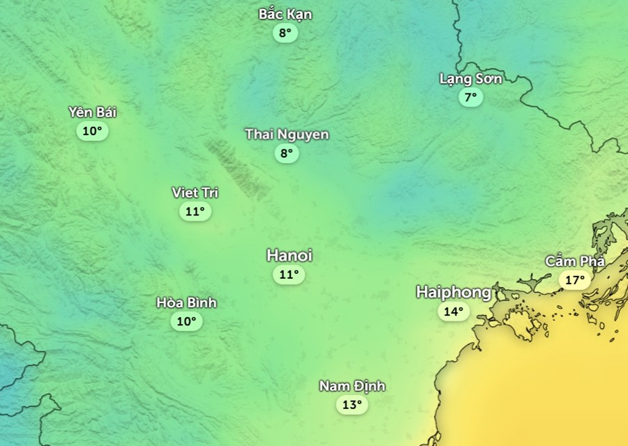 Dự báo nhiệt độ cảm nhận ở một số khu vực tại miền Bắc sáng 1/12: Hà Nội tăng nhiệt đáng kể. Ảnh: Zoom Earth, OpenStreetMap, ICON.