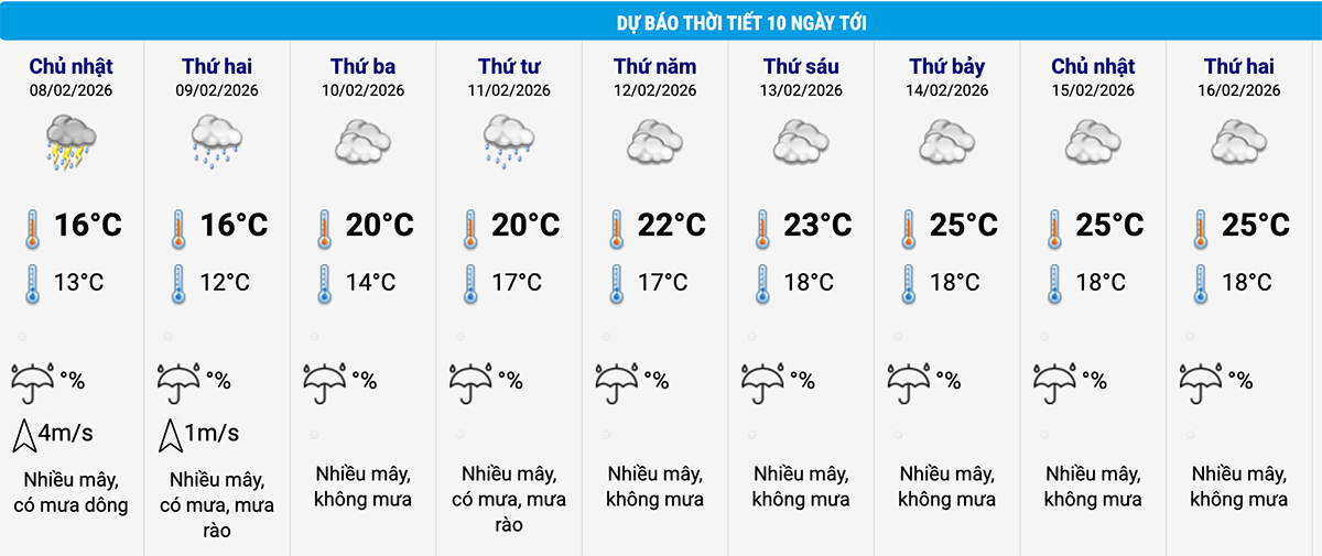 Ngày 10/2, khu vực này trời tạnh ráo, nhiều mây, không mưa, nhiệt độ tăng trở lại, cao nhất tăng khoảng 4°C lên mức 20°C, thấp nhất 14°C.