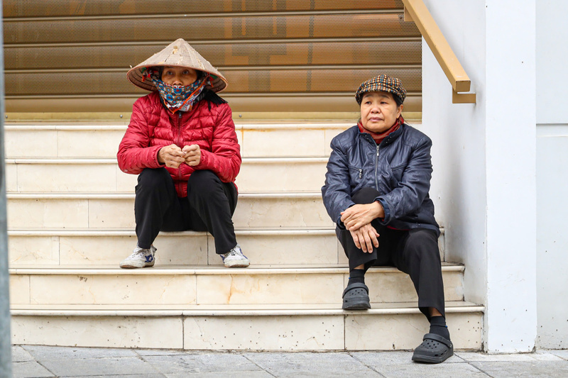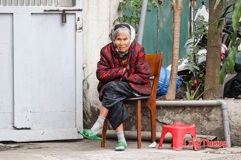 Cụ già co ro trong chiếc áo ấm, lặng lẽ chống chọi với cái rét buốt giữa phố phường Hà Nội những ngày nhiệt độ xuống sâu. Ảnh: Thái Mạnh