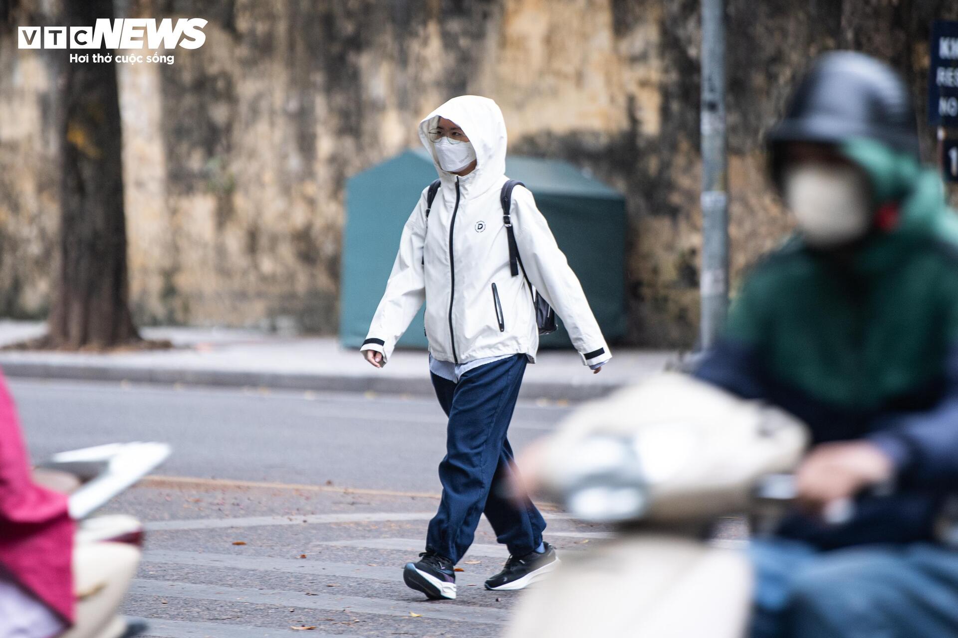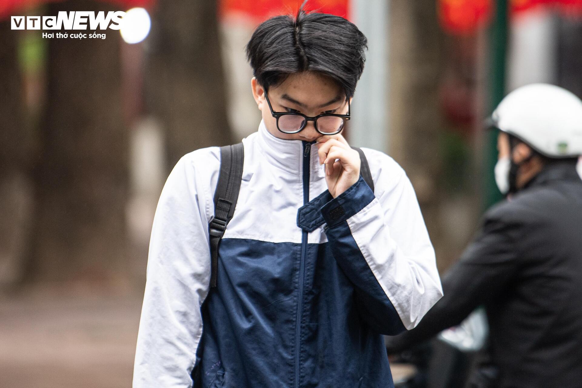 Trên các tuyến đường, người đi làm, đi học co ro trong lớp áo dày, đội mũ trùm đầu, đeo khẩu trang kín mít.