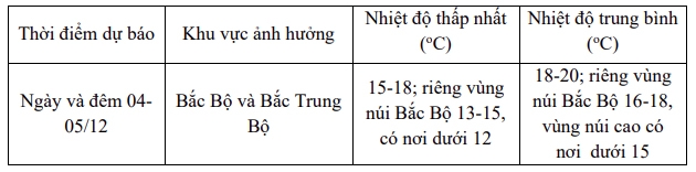 Ở khu vực Bắc Bộ và Bắc Trung Bộ có mưa nhỏ vài nơi. Trời rét, vùng núi cao của Bắc Bộ có nơi rét đậm. Nhiệt độ thấp nhất trong đợt không khí lạnh này ở khu vực Bắc Bộ và Bắc Trung Bộ phổ biến từ 15-18 độ, ở khu vực vùng núi Bắc Bộ phổ biến từ 13-15 độ, có nơi dưới 12 độ. Khu vực Hà Nội: có lúc có mưa nhỏ. Trời rét. Nhiệt độ thấp nhất trong đợt không khí lạnh này phổ biến 15-18 độ.