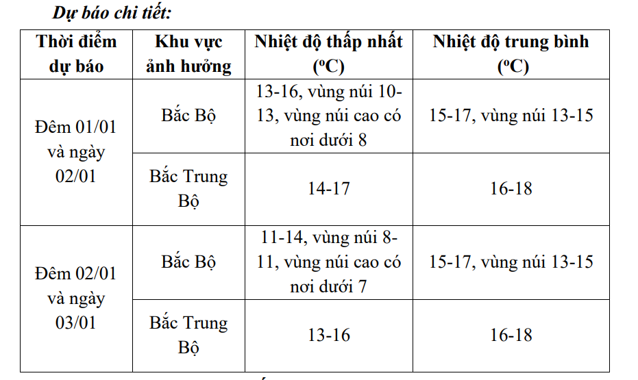 Khu vực Hà Nội, chiều tối và đêm 1/1 có mưa, mưa rào; từ tối và đêm 1/1 trời chuyển rét. Nhiệt độ thấp nhất trong đợt không khí lạnh này phổ biến 12-14 độ C.