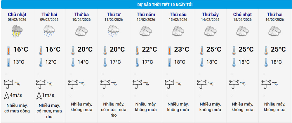 Khu vực Hà Nội từ chiều 7/2 đến đêm 8/2 có mưa, mưa rào; ngày 8-9/2 trời rét đậm. Nhiệt độ thấp nhất trong đợt không khí lạnh này phổ biến 10-12 độ.