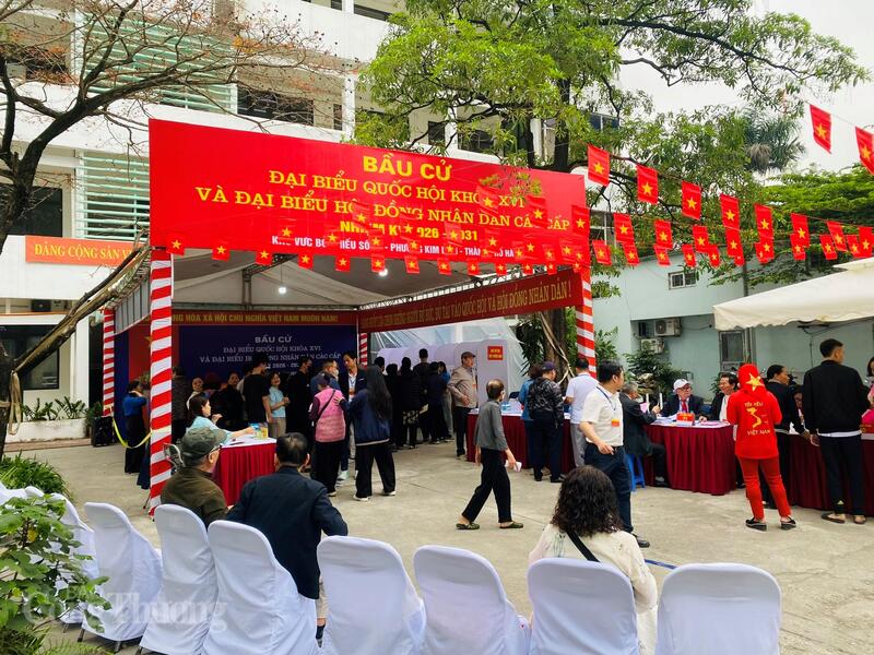 Không khí rộn ràng tại Khu vực bỏ phiếu số 23, phường Kim Liên trong ngày hội bầu cử của toàn dân.