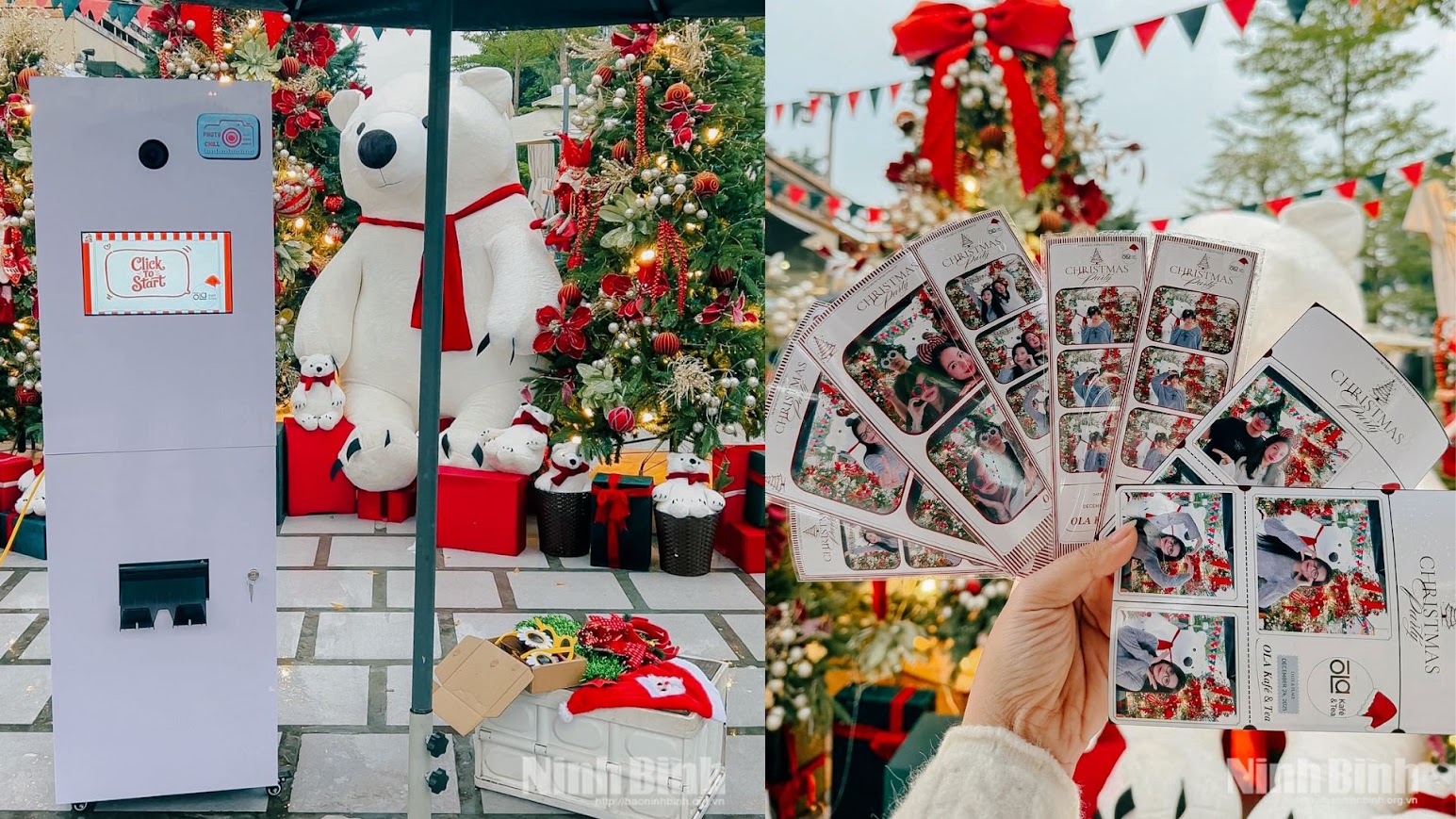 Chủ quán đã bố trí sẵn máy chụp ảnh photobooth và các đạo cụ chụp hình, giúp khách hàng dễ dàng lưu lại những bức ảnh kỷ niệm trong không gian Giáng sinh.
