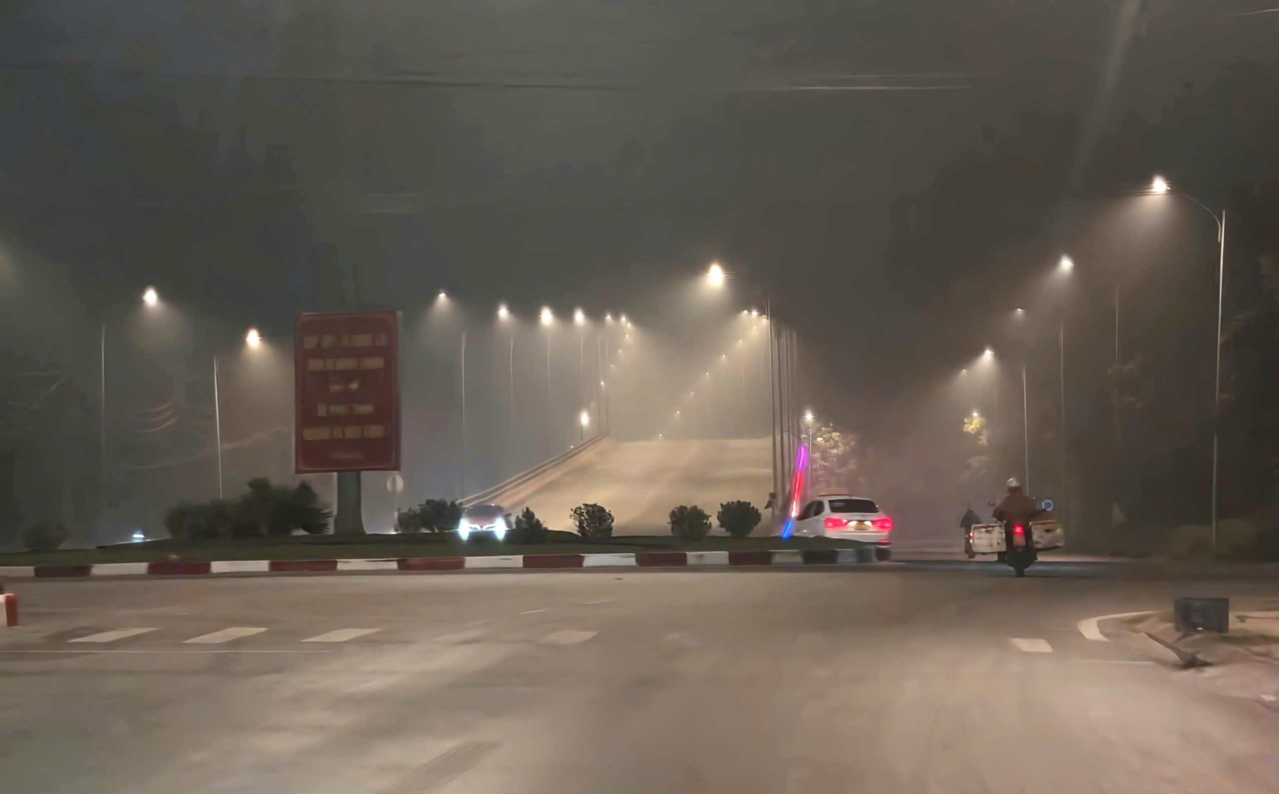 Đường Võ Nguyên Giáp, phường Đa Mai, tỉnh Bắc Ninh chìm trong sương mù và bụi mịn.