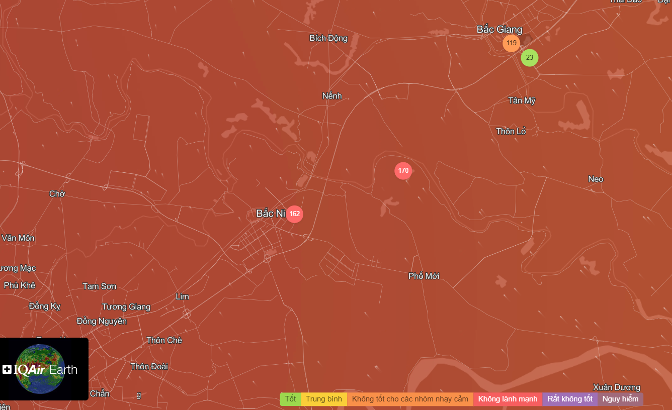 Chỉ số chất lượng không khí (AQI⁺) tại Bắc Ninh chiều 10/12.