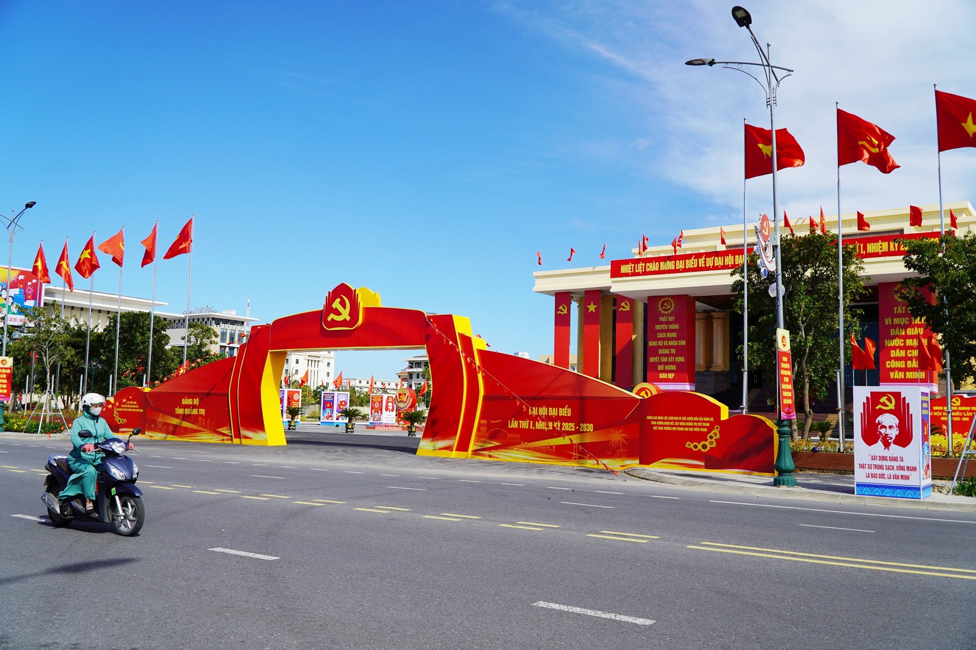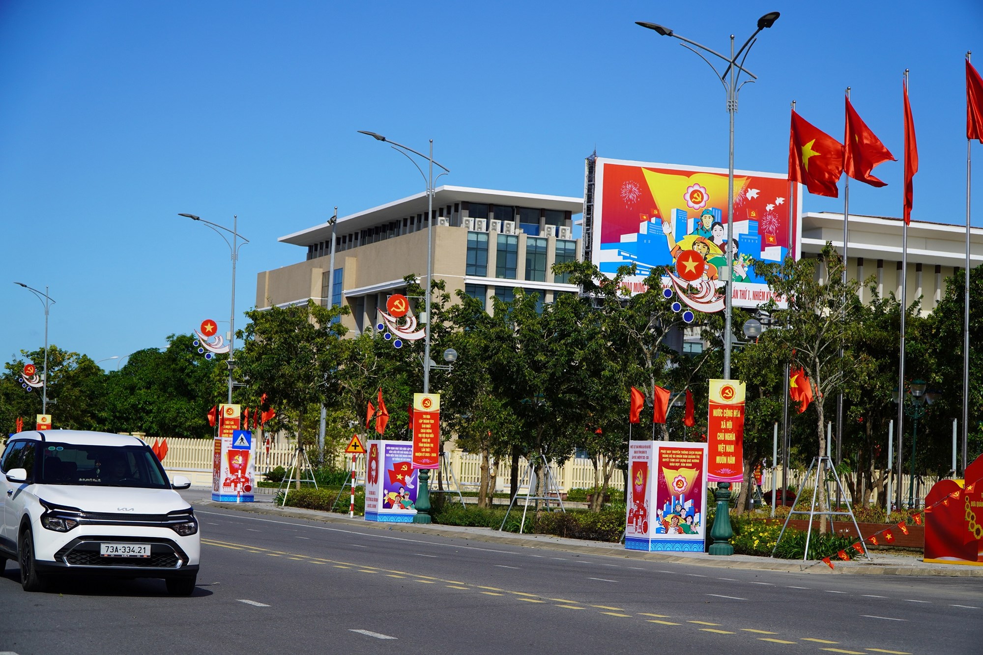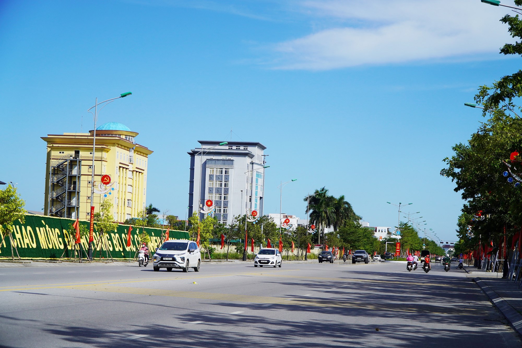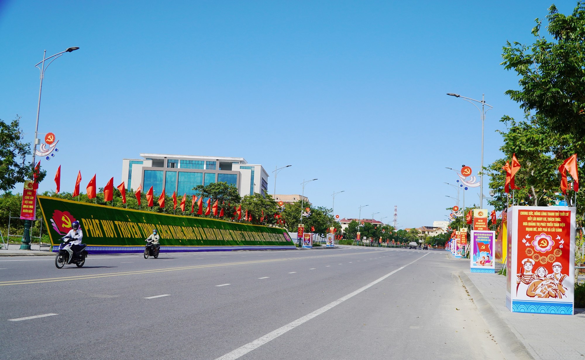 Đường Phạm Văn Đồng (phường Đồng Hới) với nhiều hồng kỳ, pano chào mừng Đại hội đại biểu Đảng bộ tỉnh Quảng Trị lần thứ I và hướng tới Đại hội đại biểu toàn quốc lần thứ XIV của Đảng