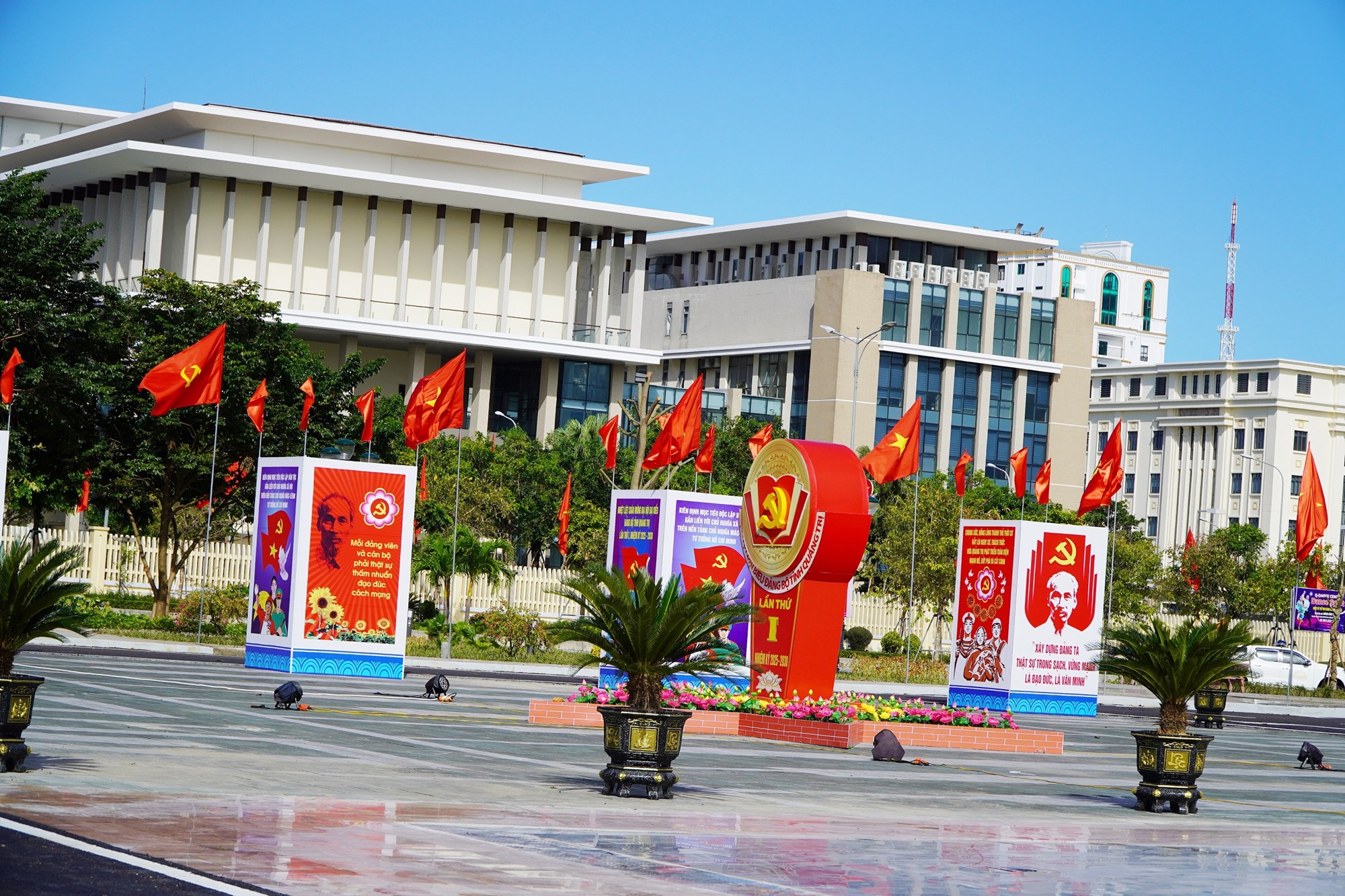 Phía trước Trung tâm được trang hoàng rực rỡ với cờ hoa, pano, khẩu hiệu… sẵn sàng cho ngày hội lớn của toàn Đảng bộ và nhân dân tỉnh Quảng Trị. Ảnh: T.B