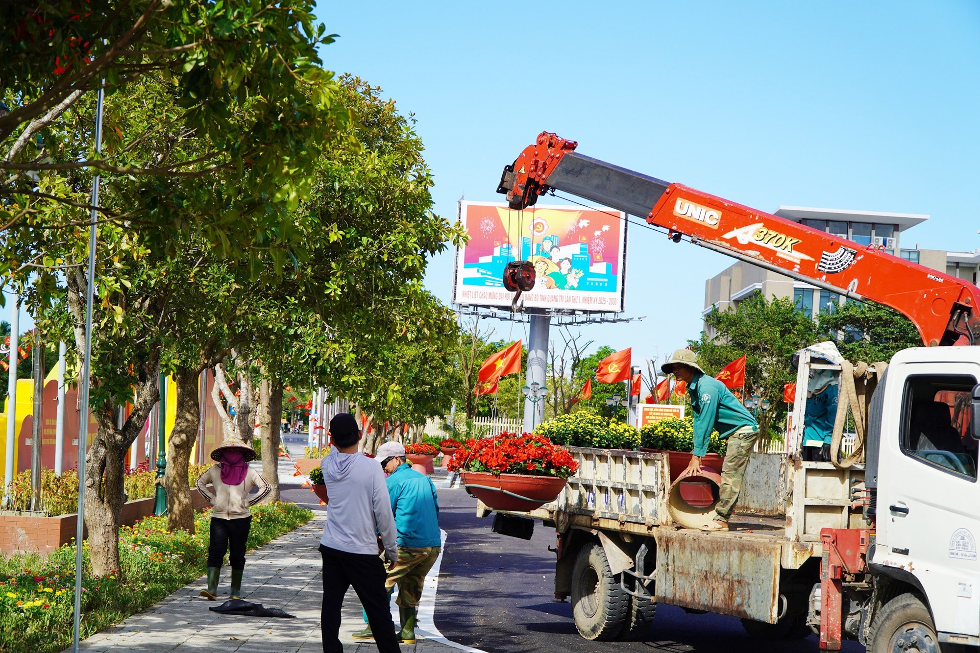 Công nhân Trung tâm Công viên cây xanh Đồng Hới khẩn trương lắp đặt, trang trí các bồn hoa tại nơi diễn ra Đại hội