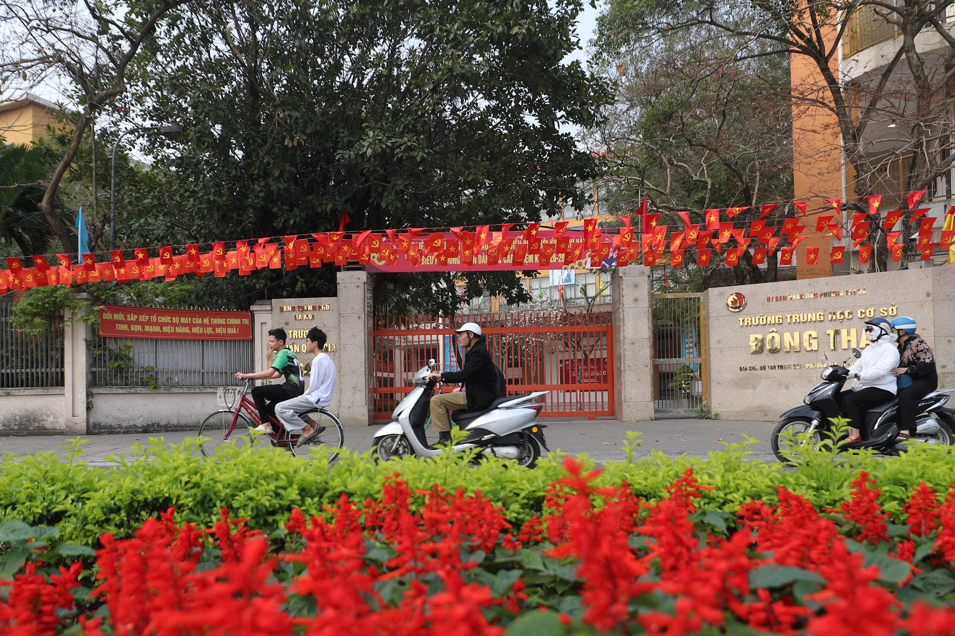 Trước cổng Trường THCS Đông Thái cũng được trang trí cờ, hoa rực rỡ. Ảnh: Ngọc Tú